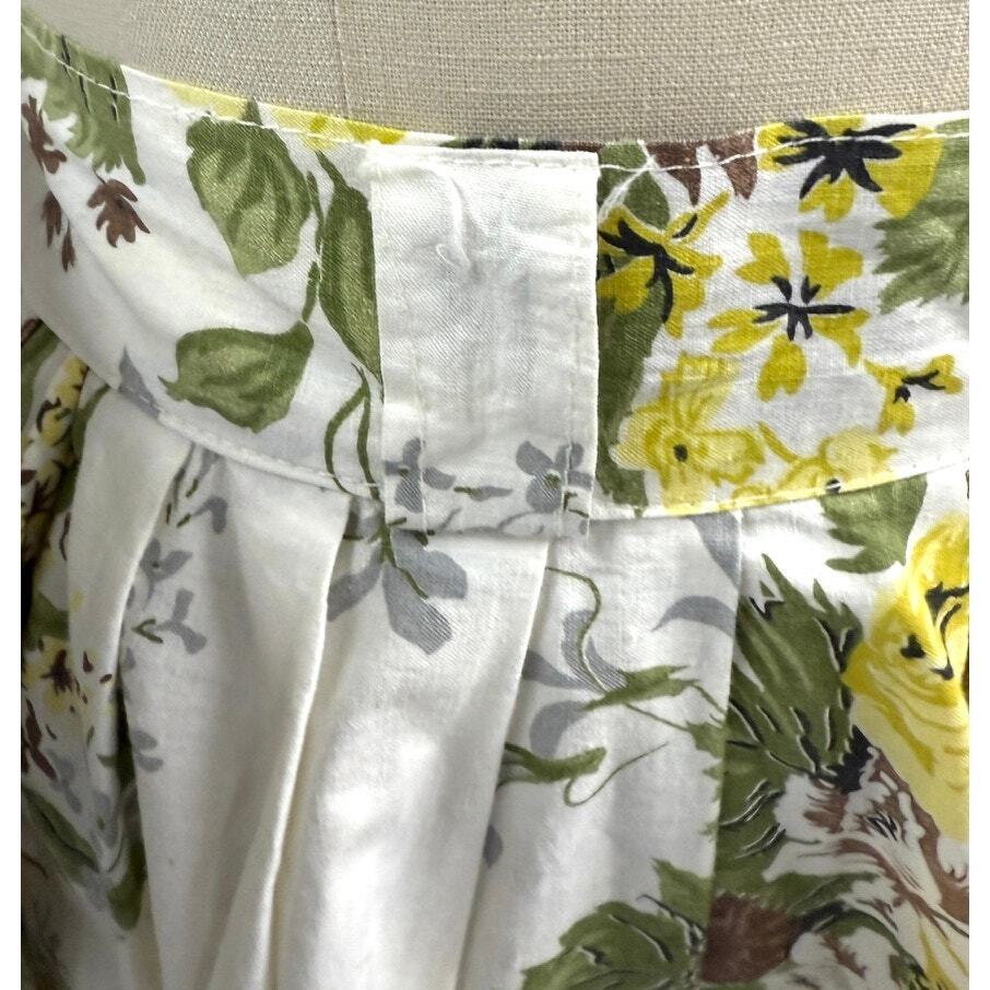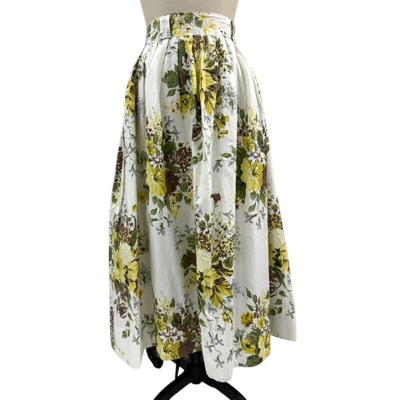 1950s VTG White Cotton Floral Skirt Yel/Brw/Green Pleated Metal Zipper Sz M
