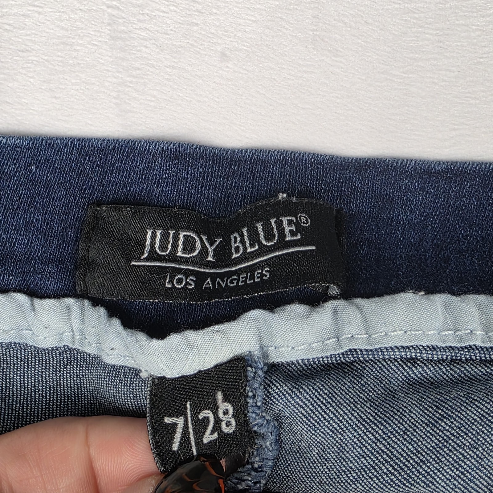 The Judy Blue Jeans in women's size 7/28 offer a super flare fit with a mid rise and side zip closure. Made from a blend of polyester, spandex, and cotton denim, these jeans feature a solid blue color with zipper and logo accents. The regular fit and flared style make them comfortable and easy to care for, suitable for any season. With a waist size of 28 inches and an inseam of 33.5 inches, these jeans are a stylish addition to any woman's wardrobe.