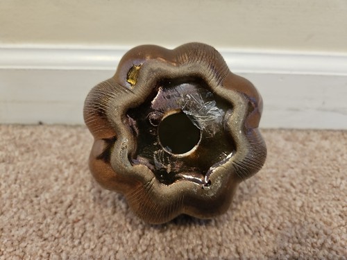 Bronze in color; 4'' tall and 4'' in diameter. Small hole in the bottom, possibly for securing on something else. Hole is about 7/8'' in diameter. Dense; weighs about 10.5 oz.