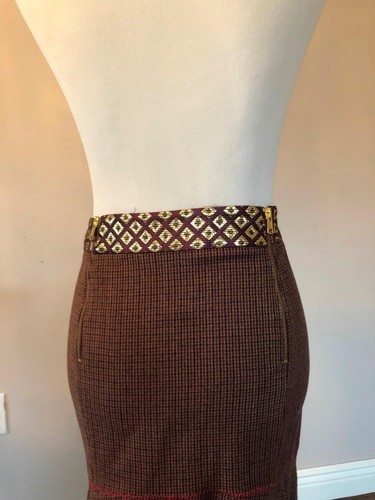 This new without tag BLUMARINE gold trimmed wool tramped skirt is in excellent condition as it has never been worn. It features: