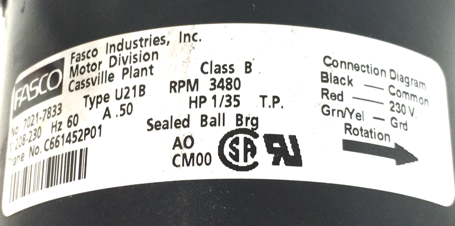 This is FASCO 7021-7833 Inducer Blower Motor C661452P01 208/230V 3480 RPM 1/35HP used refurbished part, both bearings are new on this motor.