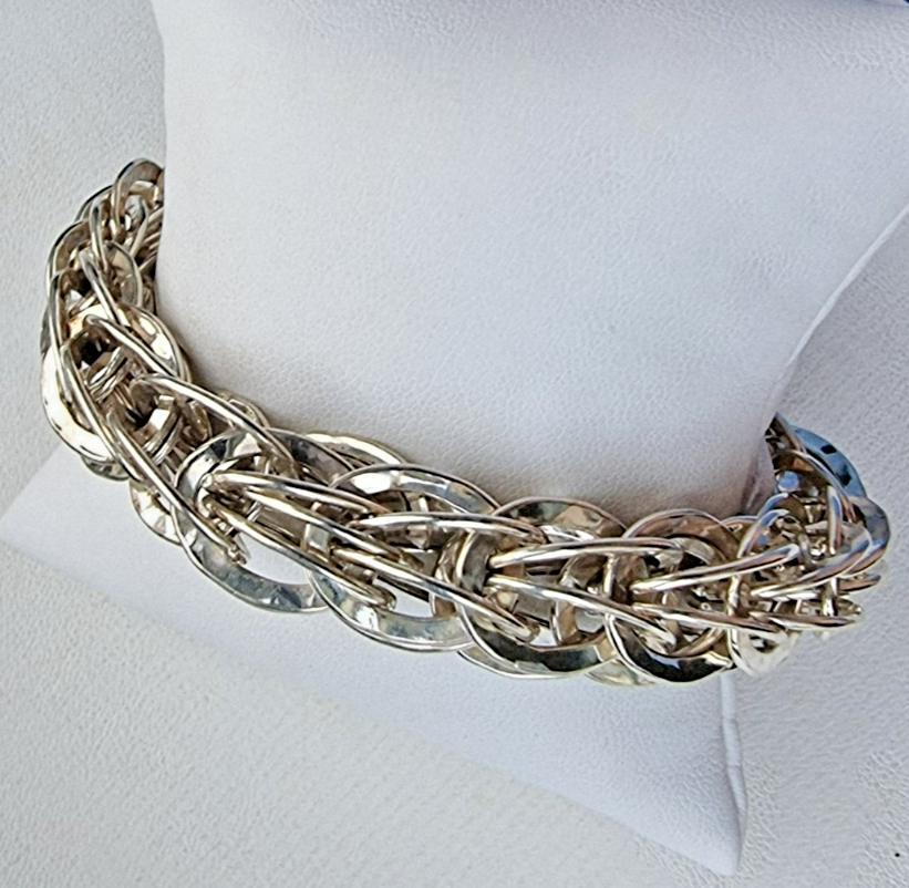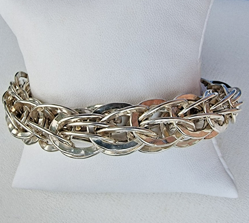 This product is a vintage 925 sterling silver jumbo spring ring bracelet featuring a 3D cable chain design. The large and heavy bracelet weighs 31.3g, making it a statement piece of fine jewelry. With a classic spring ring closure, this bracelet is a stylish and unique accessory for any outfit, perfect for those who appreciate beauty and timeless elegance in their jewelry collection.