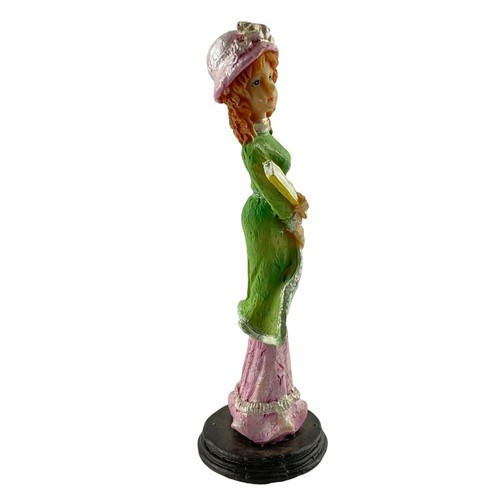 Victorian Lady Figurine Resin Sculpture Pink and Green Dress Fan Hat