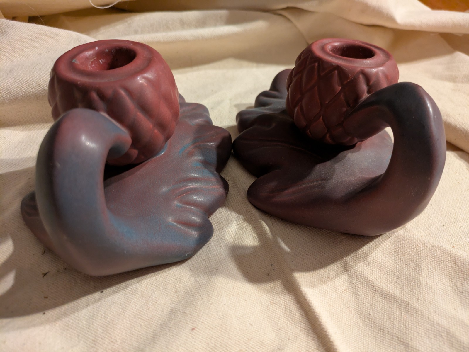 Coppia Di Van Briggle Ceramiche Ghianda Foglia Portacandele Manico Opaco Viola