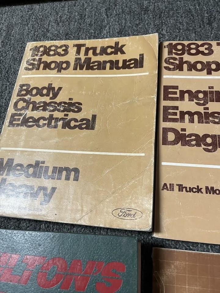 Factory 1983 Ford Medium / Duty Duty Truck Body / Chassis / Electrical Service Manual, Moteur Service Manual, Pre-livraison d'entretien et de lubrification Manuel, Manuel de diagnostic des emissions de moteur, Manuel de Chiltons, Manuel du schema de cablage, Manuel de specifications et guide d'identification