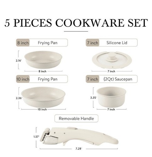 CAROTE 5-Pc. Nonstick Cookware Set ~ Detachable Handle ~ Granite Pot & Pan Set