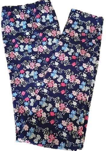 Leggings are a Multicolored Floral Design on a Blue Background ~ 57% Cotton ~ 38% Polyester ~ 5% Spandex