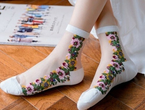 Handcrafted ~ White ~ Embellished w/Pearls ~ Lace ~ Floral Design ~ Ankle Socks