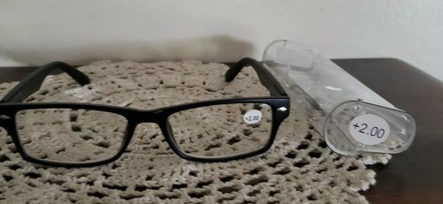 Black Plastic Framed ~ Spring Hinged ~ +2.00 Reading Glasses w/Clear Case ~L10A