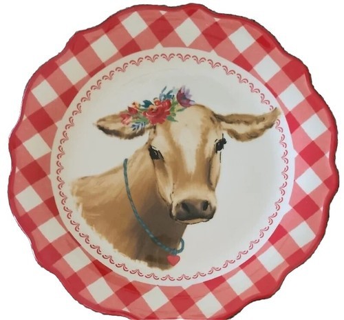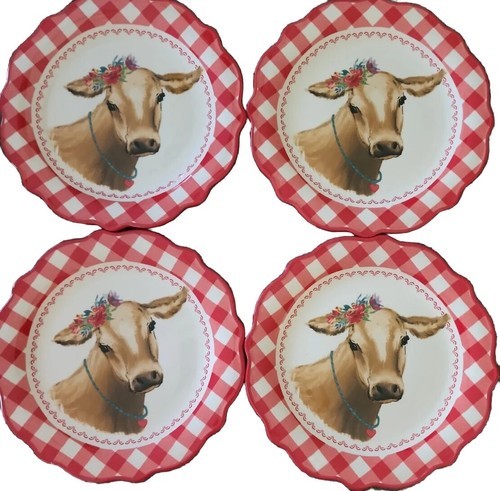 Four (4) Pioneer Woman ~ Red & White Gingham w/Cow Pattern ~ 8.7" Salad Plates