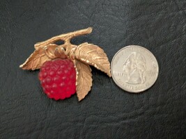 Cette broche de broche de framboise Napier de 1960 presente une conception de tonalite rouge et doree avec des feuilles de verre et une branche mesurant 1,5 pouces de longueur. La broche est signee par Napier et est parfaite pour des occasions comme Noel, la remise des diplomes, les anniversaires, les anniversaires, les bapteme et la Saint-Valentin. Fabrique avec un melange de verre et de metaux, cette piece de style vintage est un ajout charmant a toute collection, presentant un theme des framboises et des fleurs. Parfait pour ajouter une touche d'elegance a toute tenue.