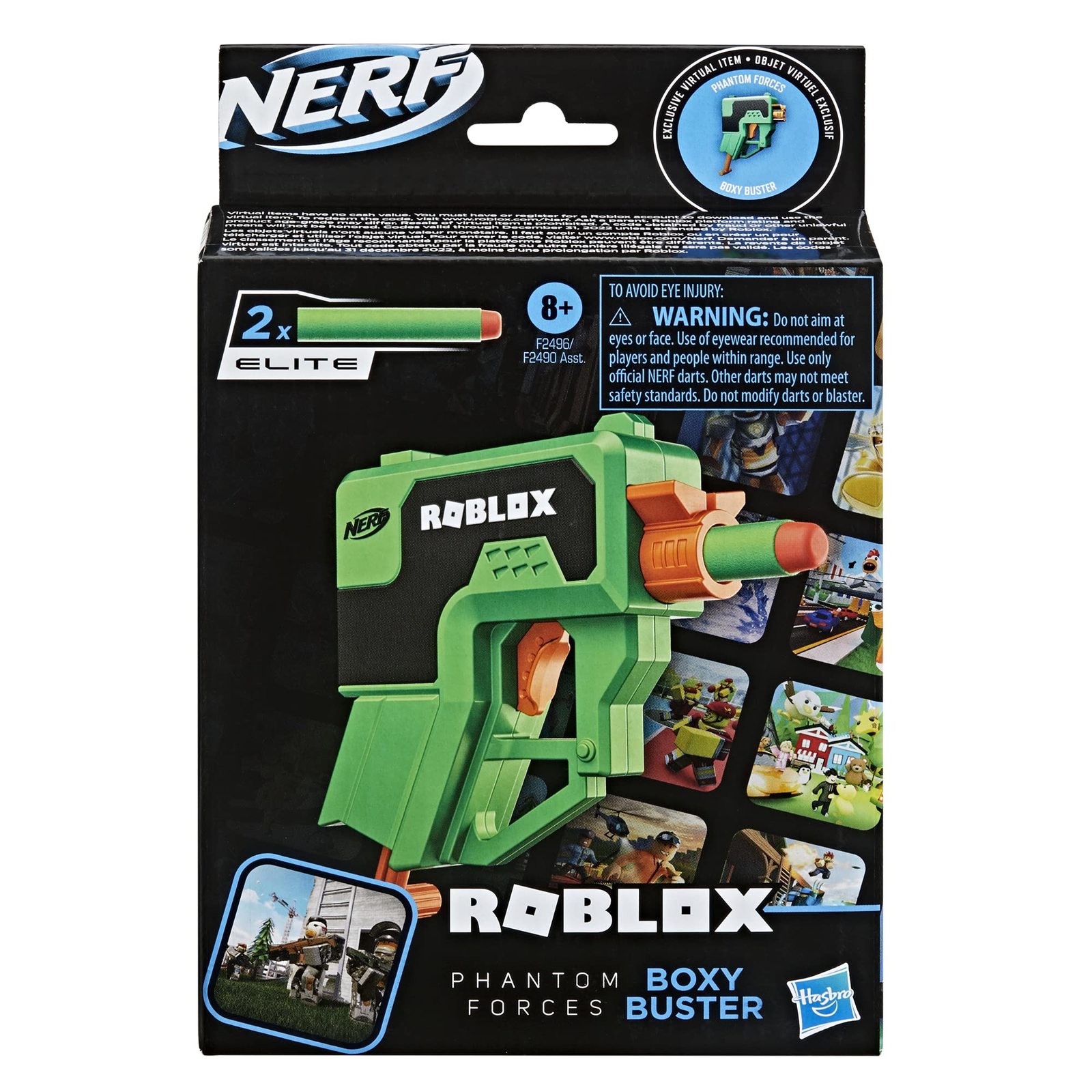NERF ROBLOX PHANTOM FORCES: BOXY BUSTER DART BLASTER: This dart-firing blaster takes its inspiration from the Roblox game Phantom Forces