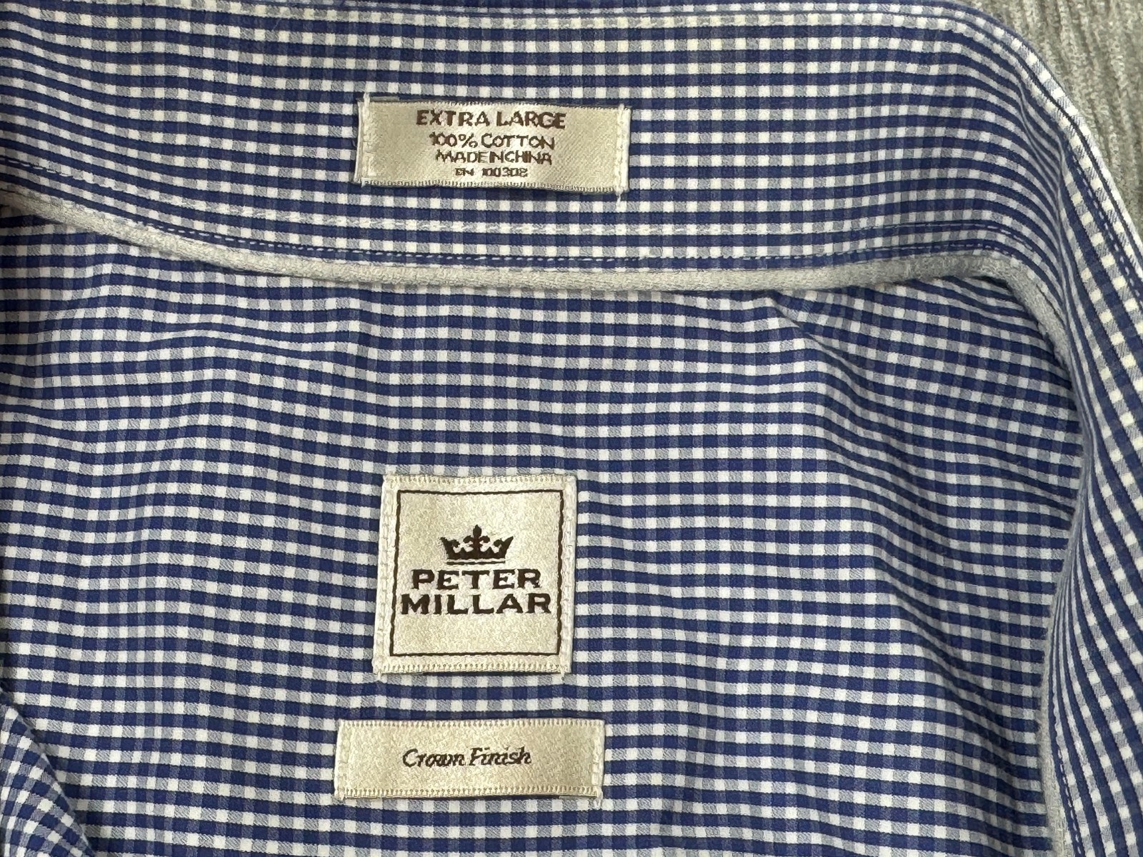 Labels/Markings: PETER MILLAR woven neck label; "Crown Finish" tag; size/care tag reads "EXTRA LARGE 100% COTTON MADE IN CHINA RN 83032"