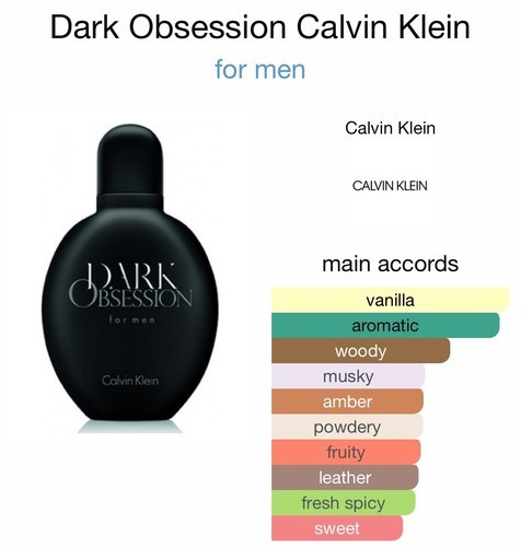 Dark Obsession by Calvin Klein is a Oriental Woody fragrance for men. Dark Obsession was launched in 2013. Top notes are Guarana, Wormwood and Green Mandarin; middle notes are Balsam Fir, Clary Sage and Vetiver; base notes are Madagascar Vanilla, Suede and Labdanum.