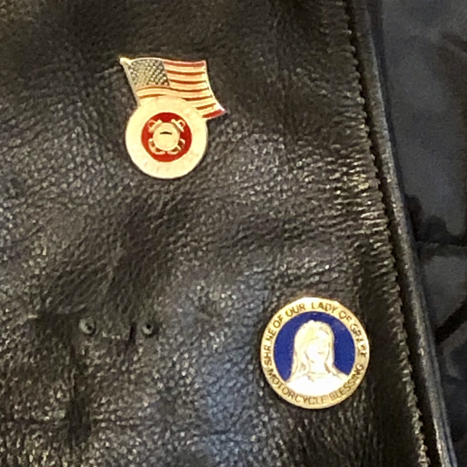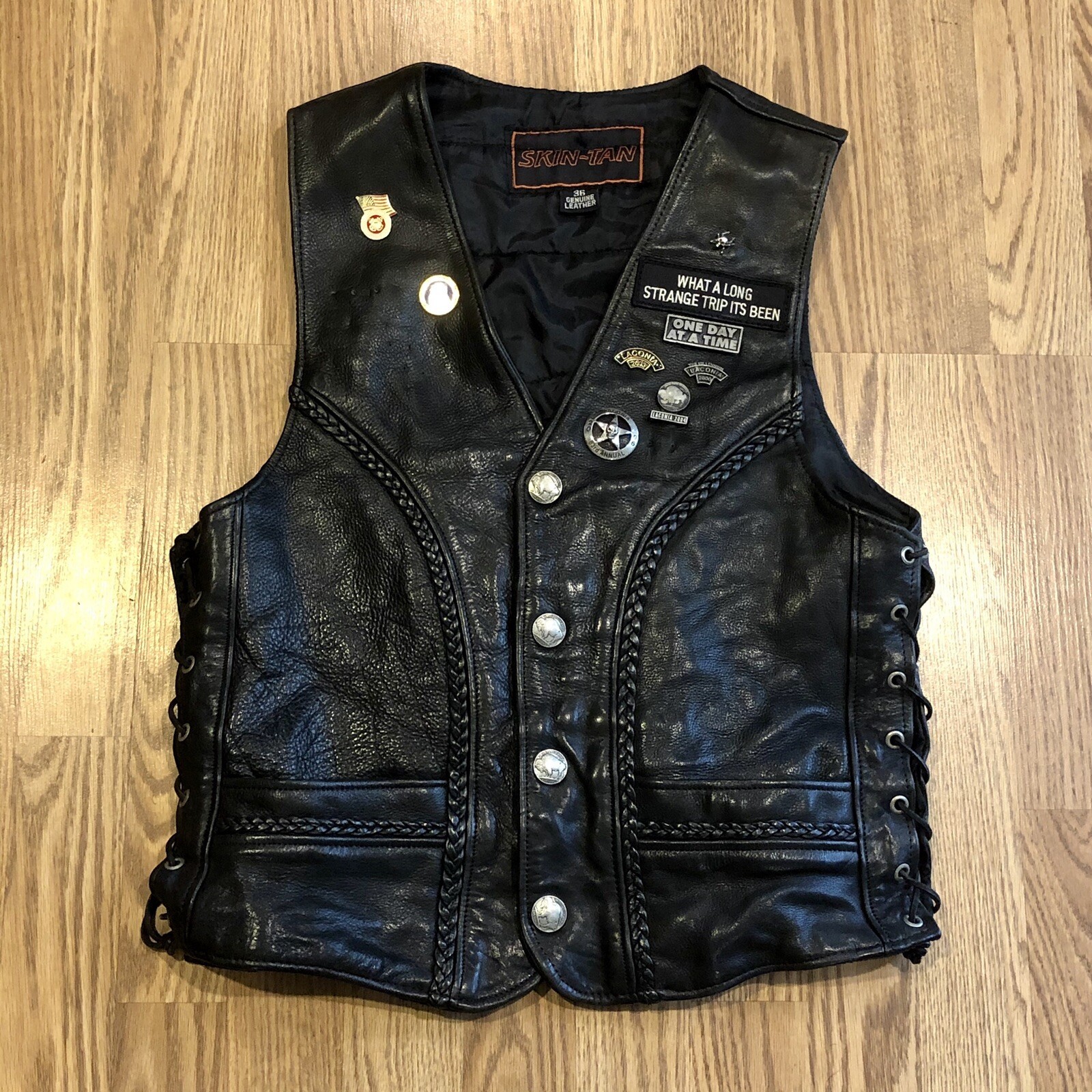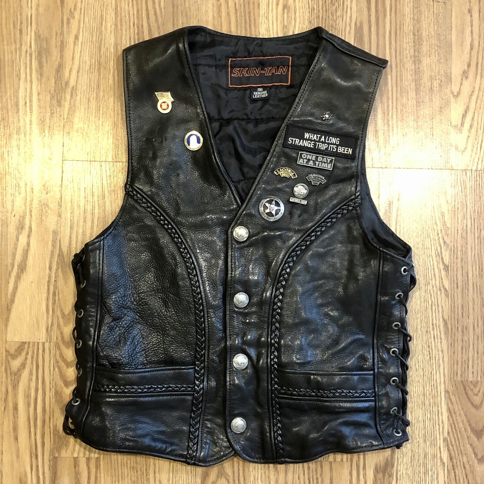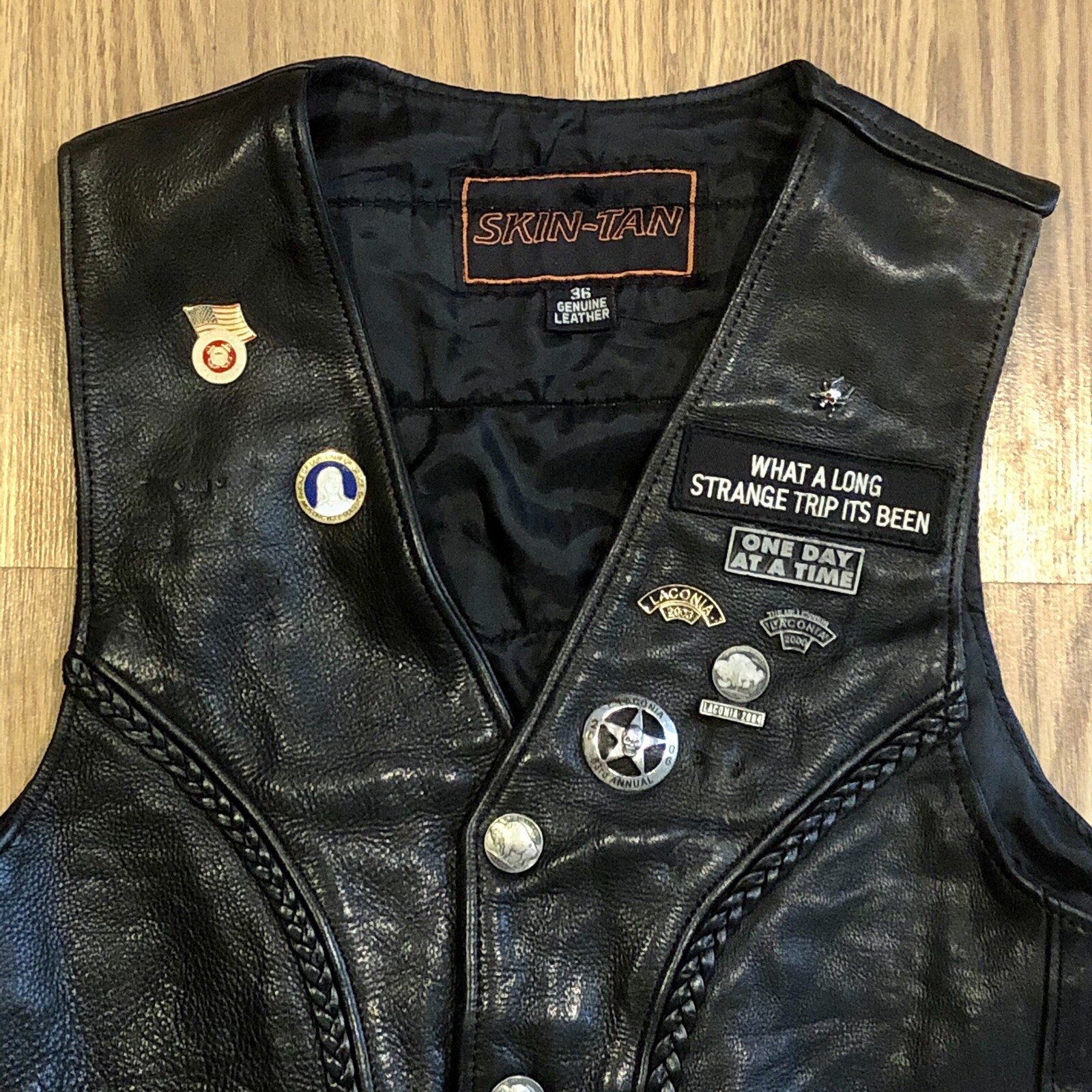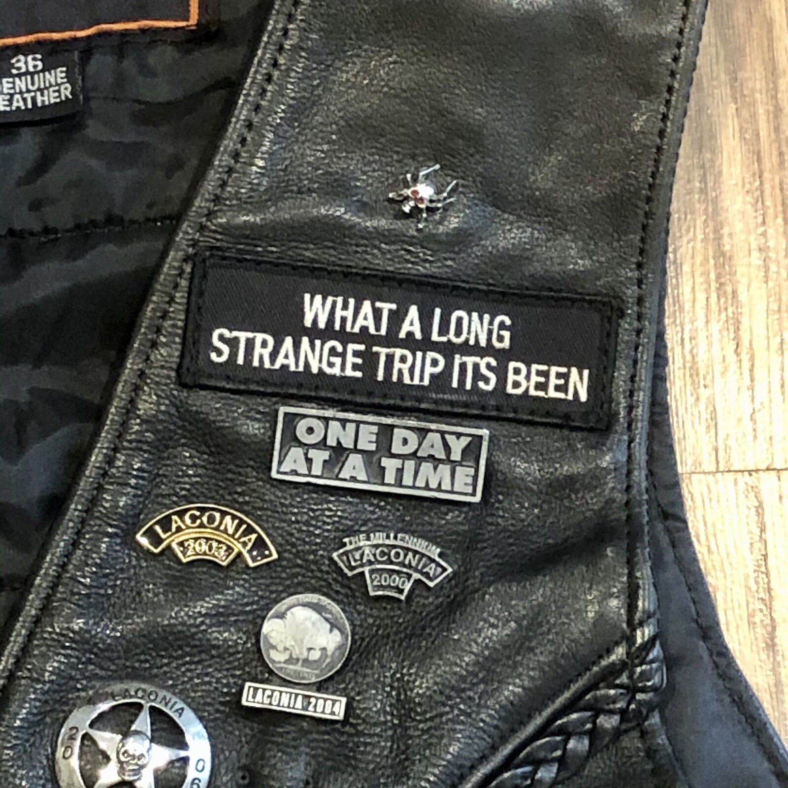 Front has multiple Laconia Bike Week pins and a patch that says "What a Long Strange Trip"