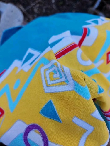Teal blue background on a geometric border print giving major Barbie/Ken vibes