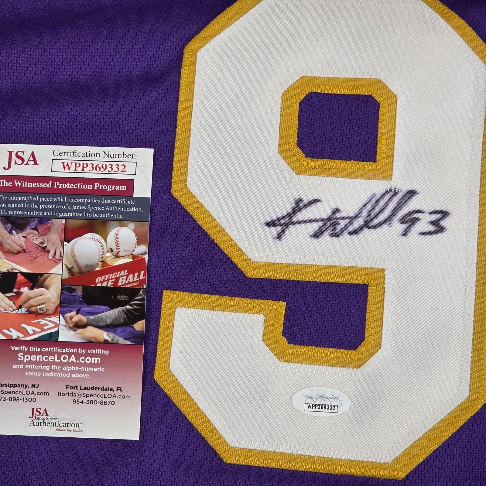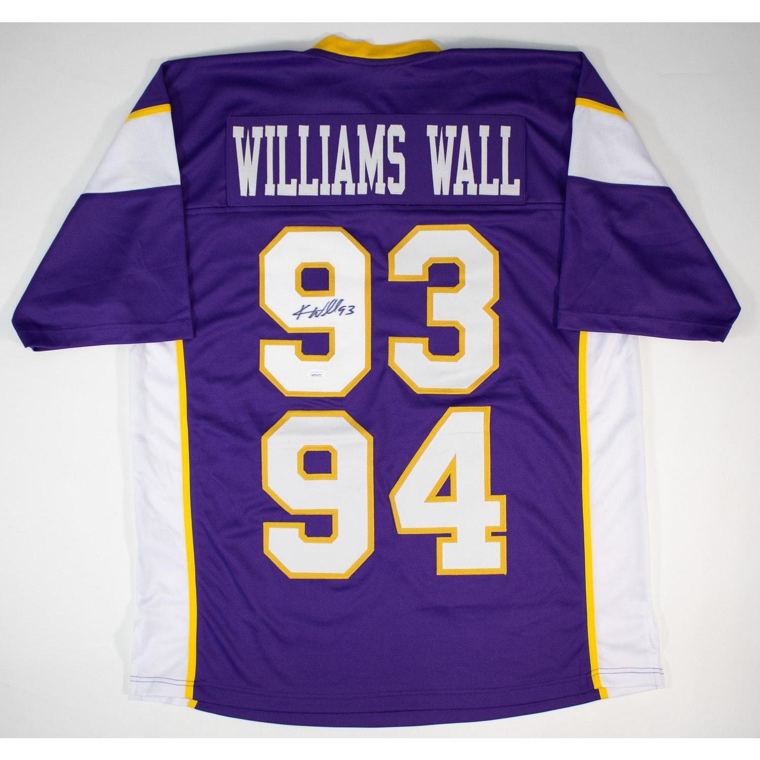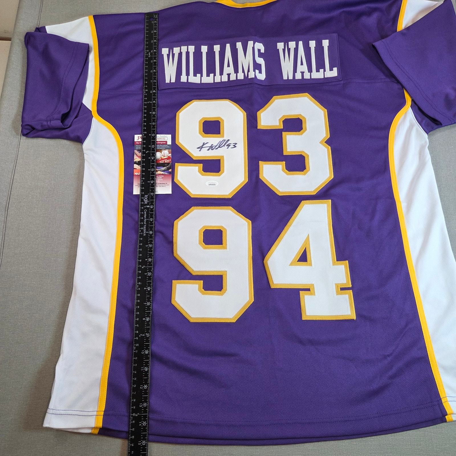 Autographed Minnesota Vikings Williams Wall custom jersey featuring Kevin Williams? authentic signature (#93) on the reverse number, professionally verified by JSA (#WPP369332). Custom fan jersey style in Vikings colors with stitched numbers and ?Williams Wall? nameplate. Perfect for display or gift for a Vikings collector.