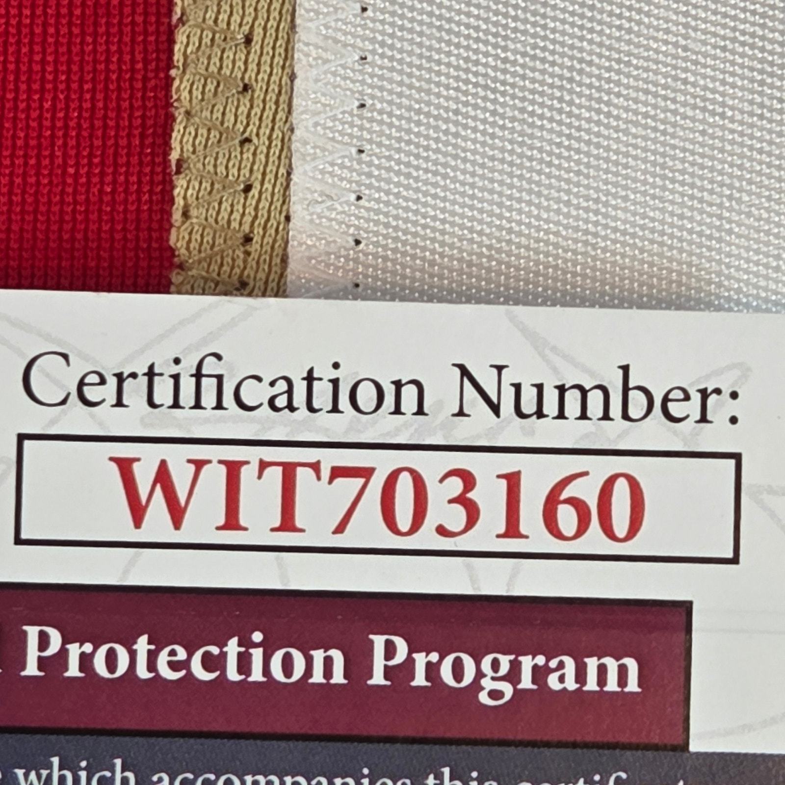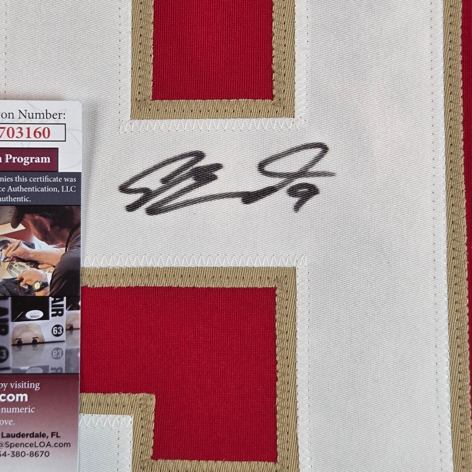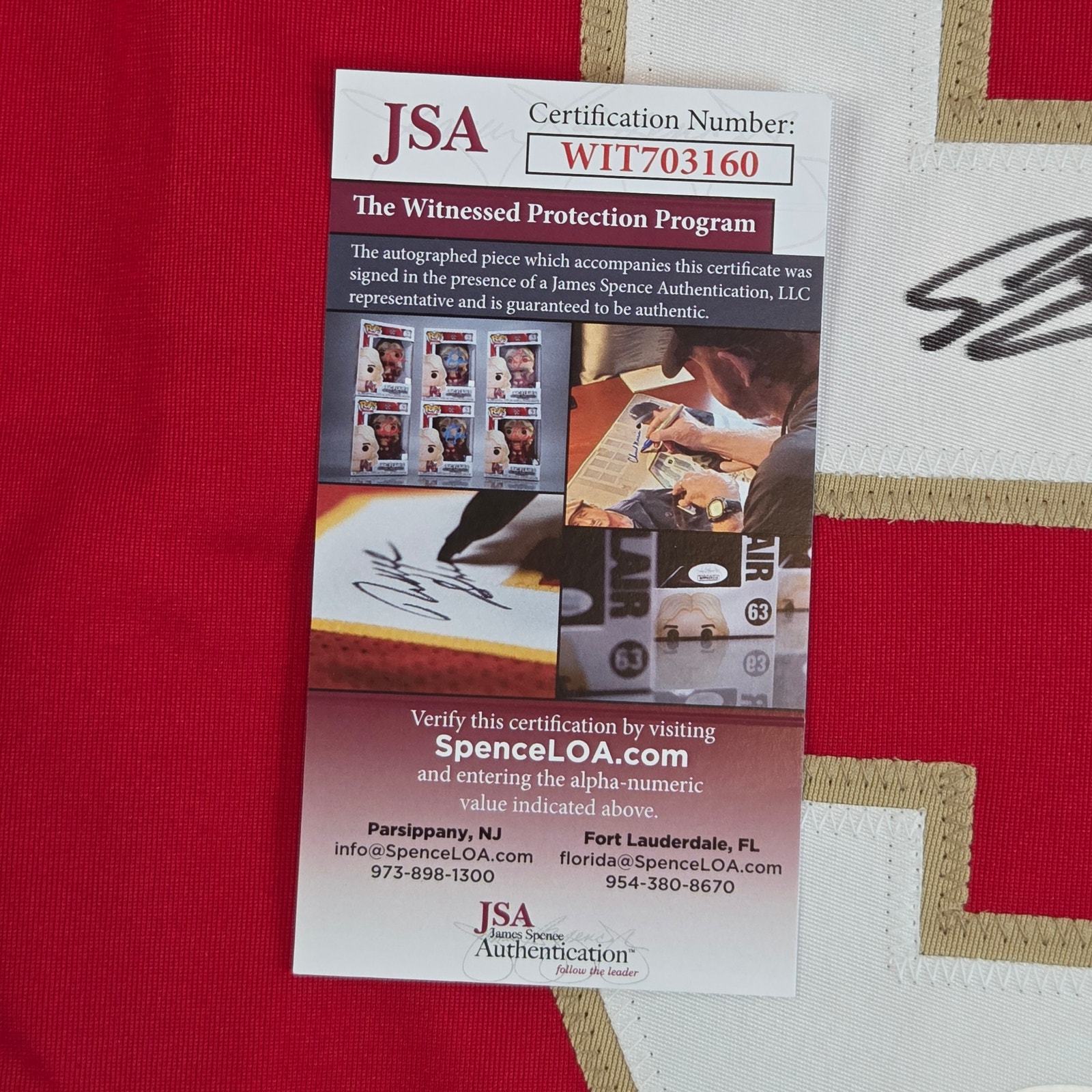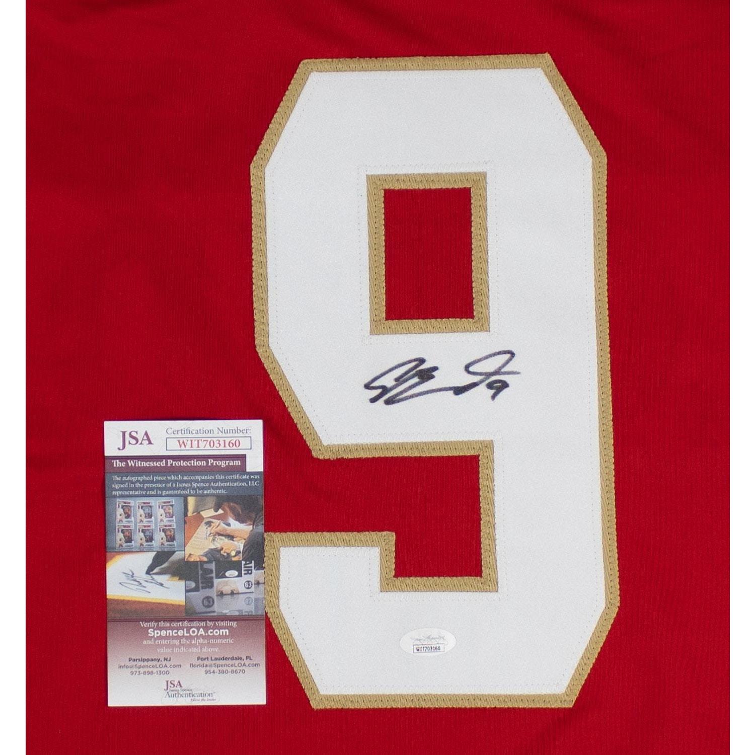 Autographed Florida Panthers Sam Bennett #9 custom hockey jersey, signed boldly on the back number and authenticated by JSA (#WIT703160). High-quality custom fan jersey in Panthers red with stitched name and numbers. Excellent collectible for hockey fans or display in a sports room.