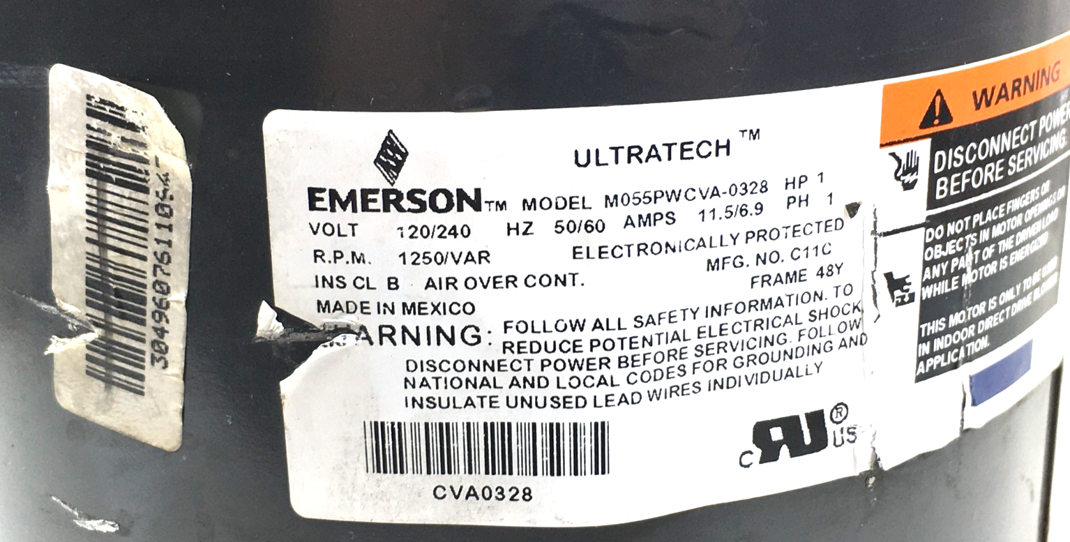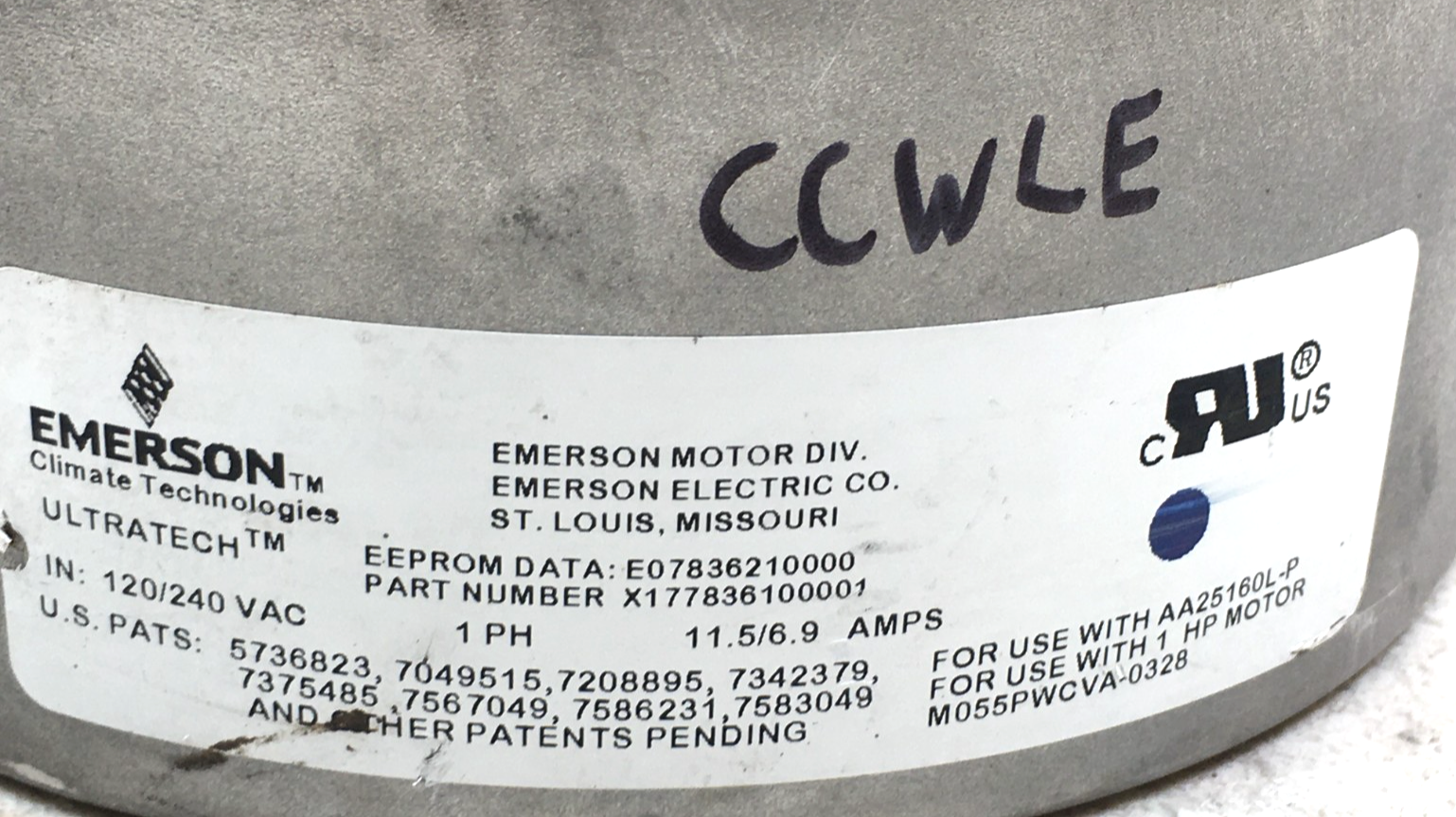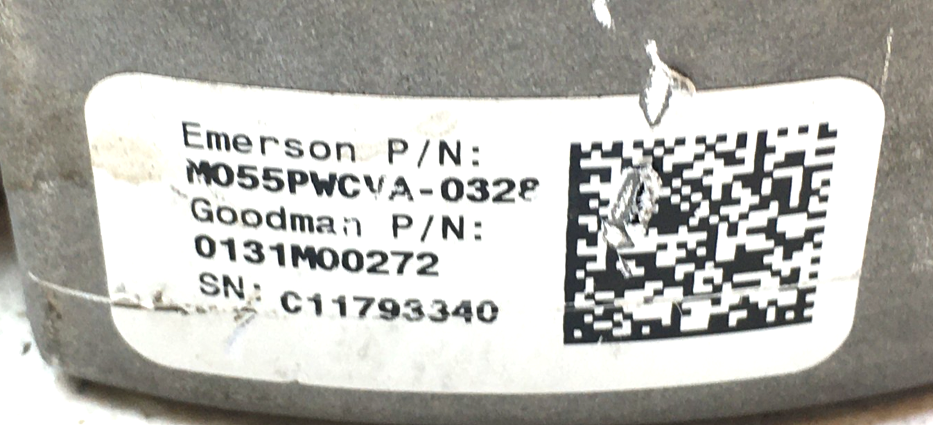This is Emerson M055PWCVA-0328 Blower Motor 0131M00272 1HP 120/240V CCW Lead End rotation, used part.