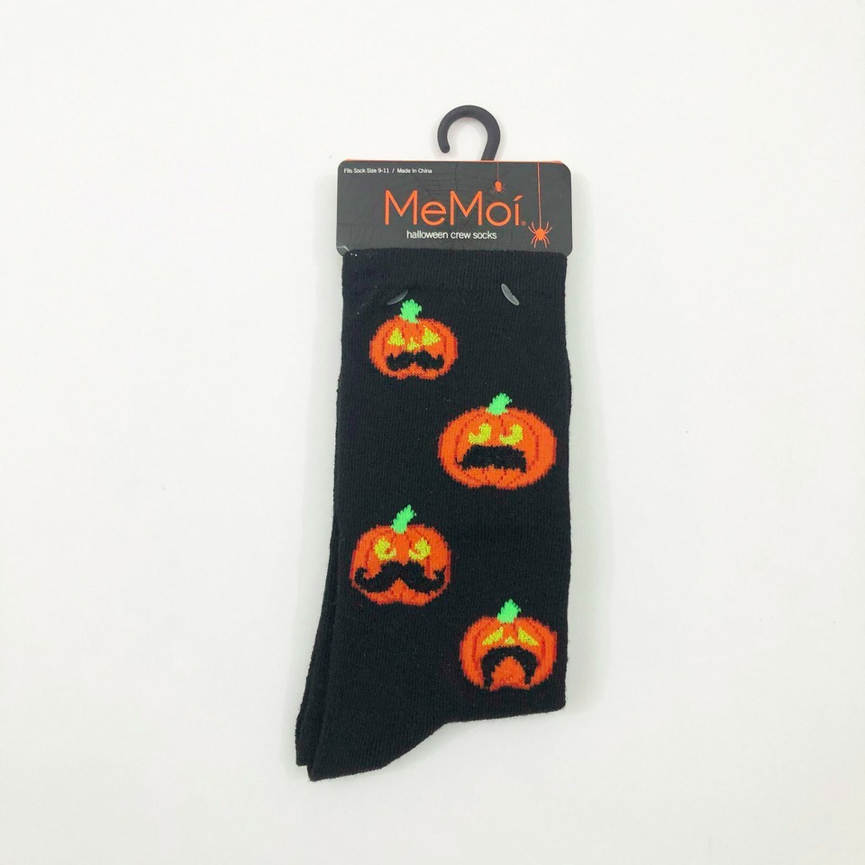 NWT MeMoi Halloween Black Crew Socks with Mustache Pumpkins US 9-11