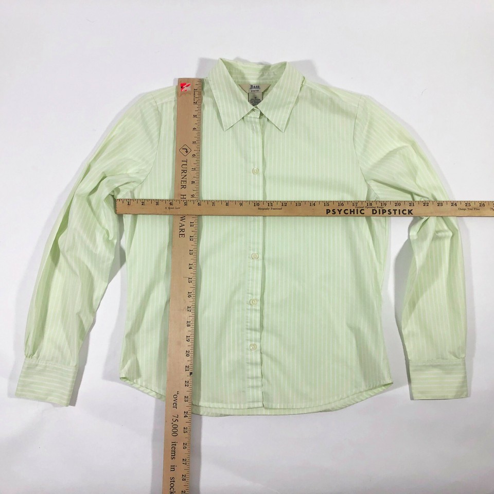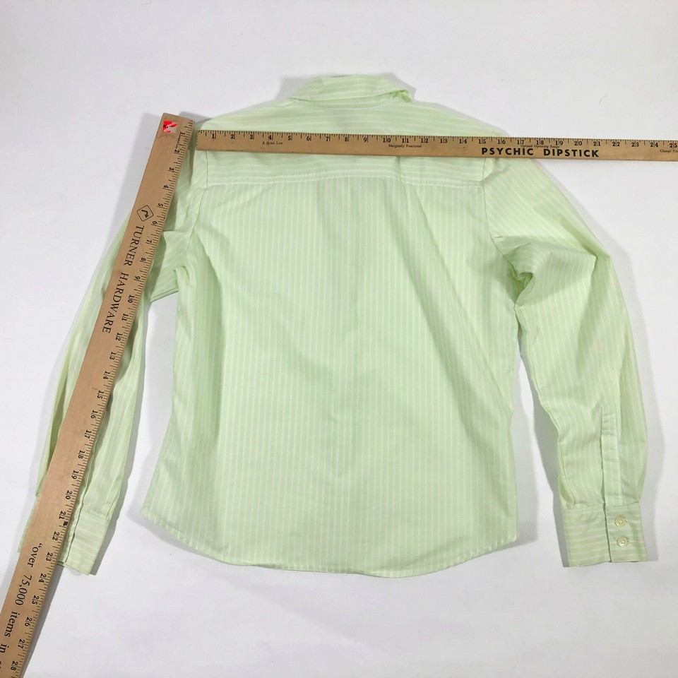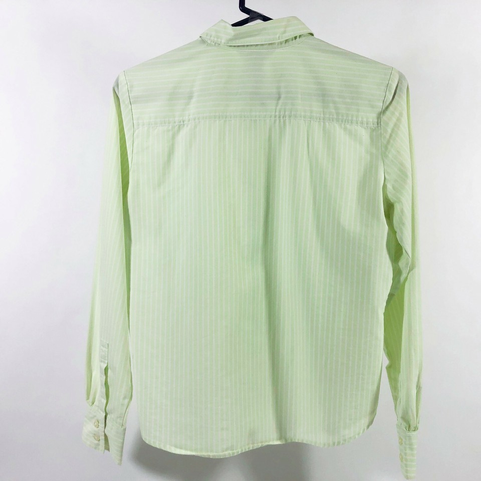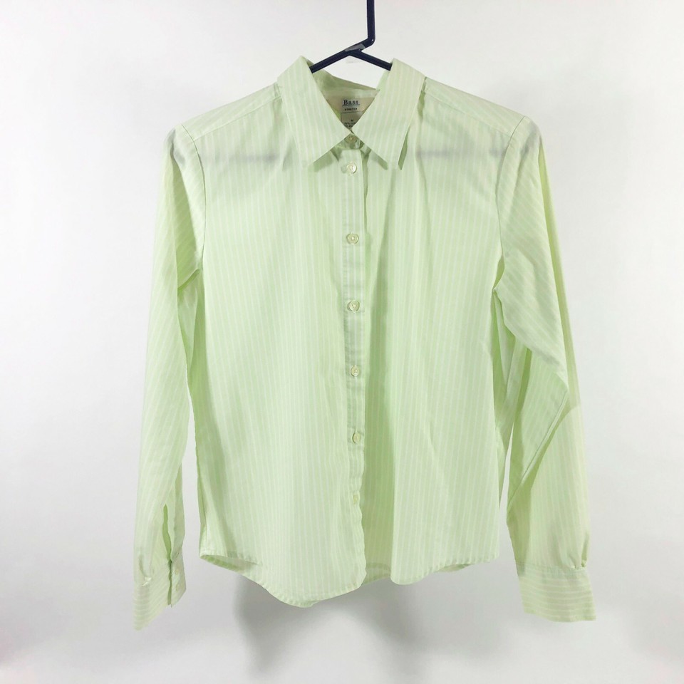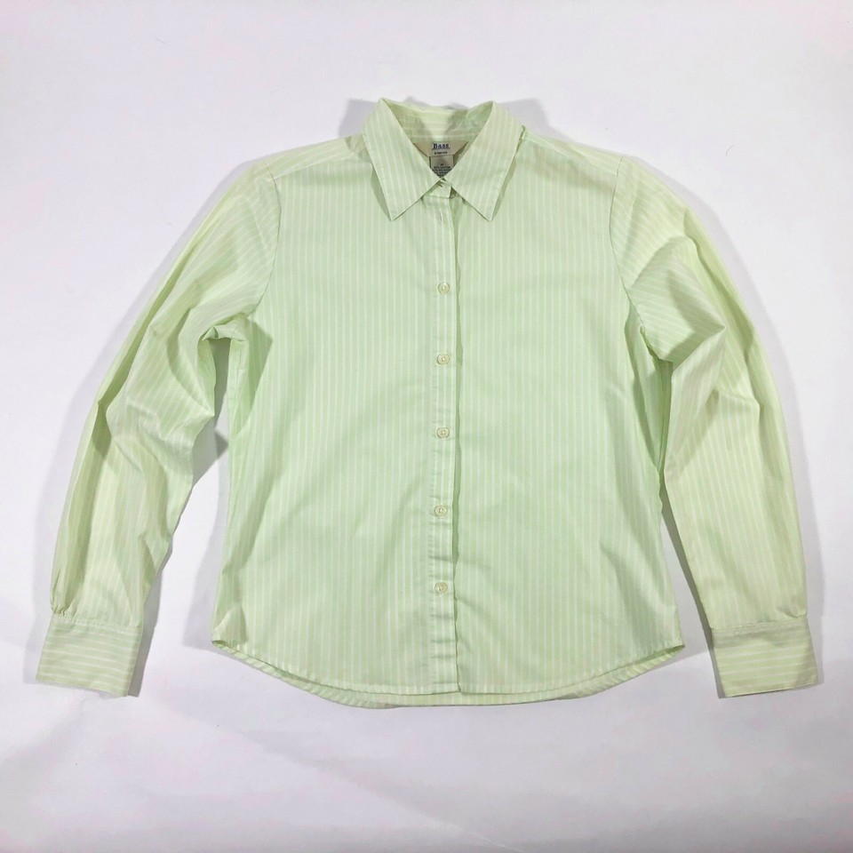 VGC, very good condition. This Bass pastel green white striped stretch long sleeve blouse has buttons down the front buttonsat the cuffs. Great for pairing with jeans or slacks. Normal signs of wear. No missing buttons. No rips, tears or stains.