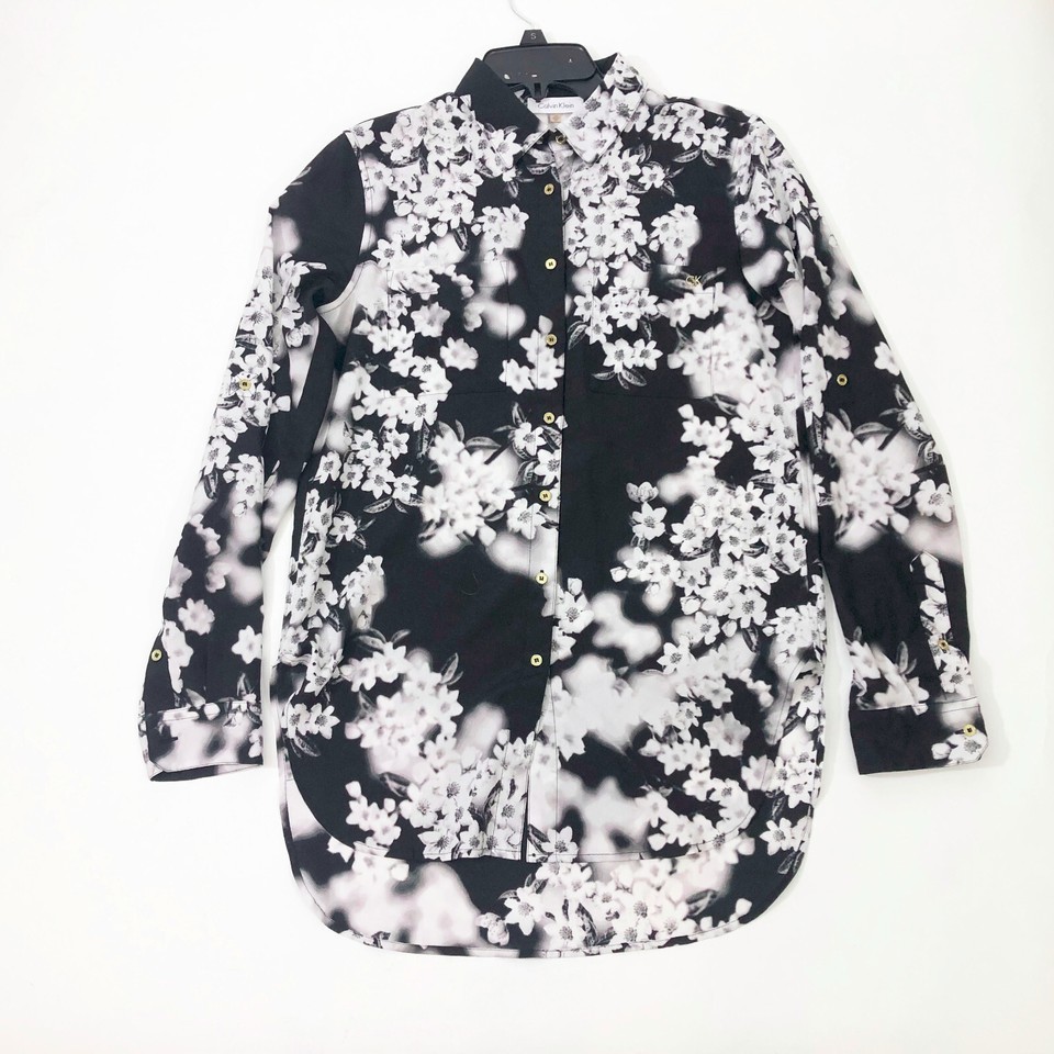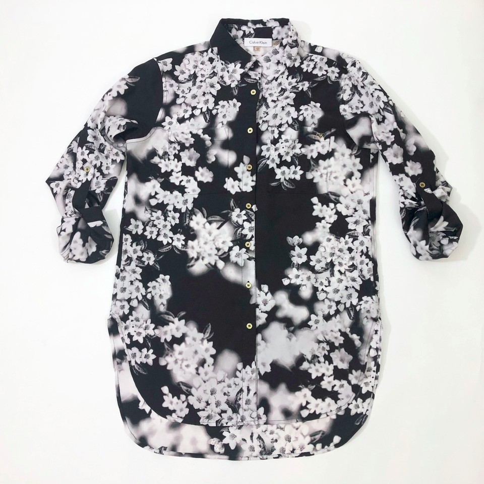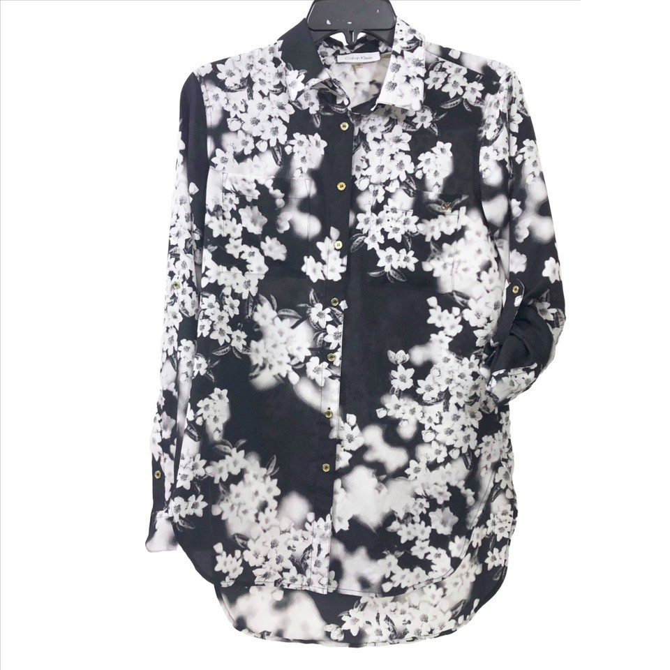 Calvin Klein Black & White Floral Long Roll Tab Sleeves Tunic Women's Size XS