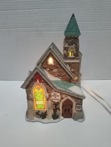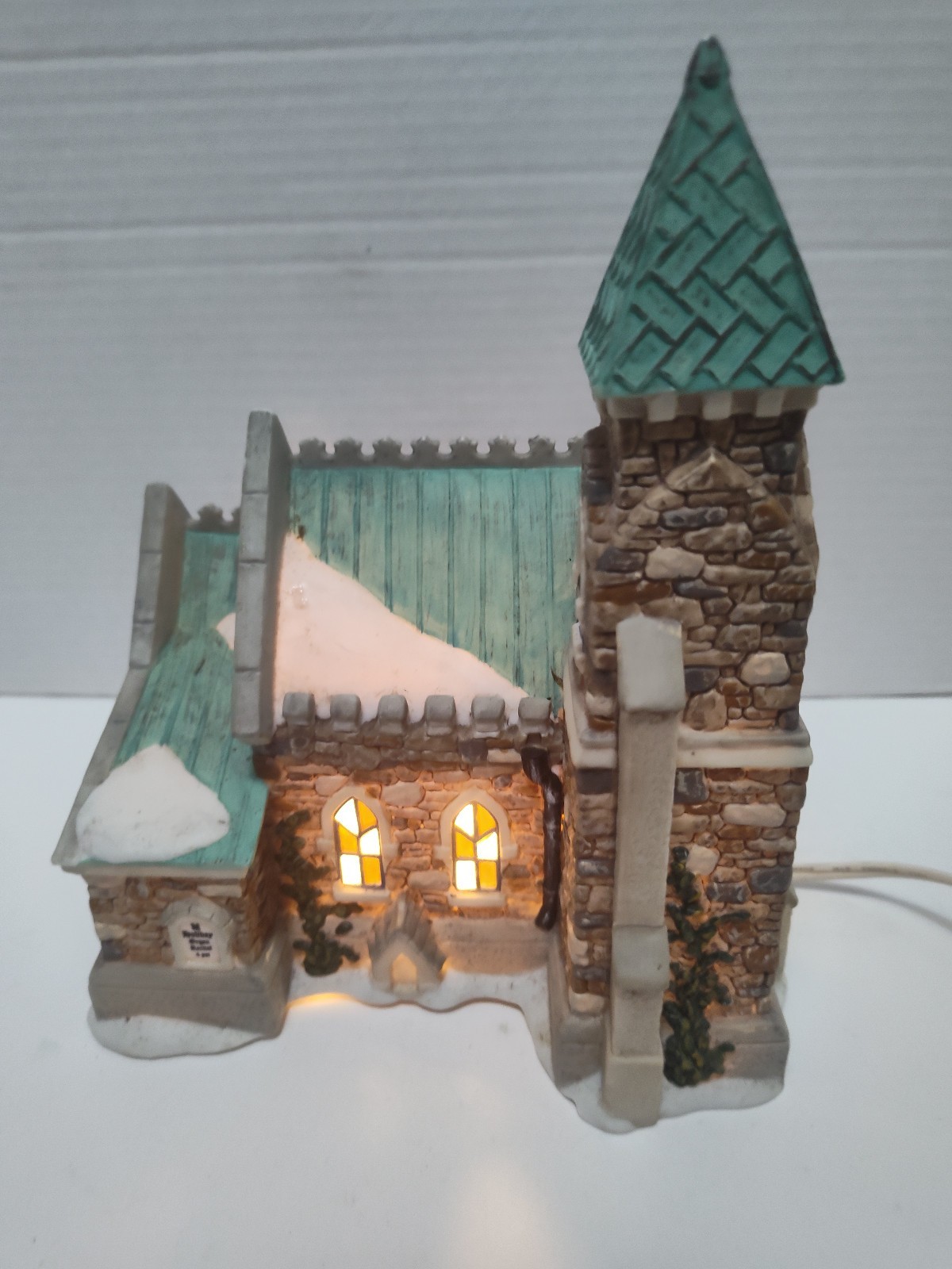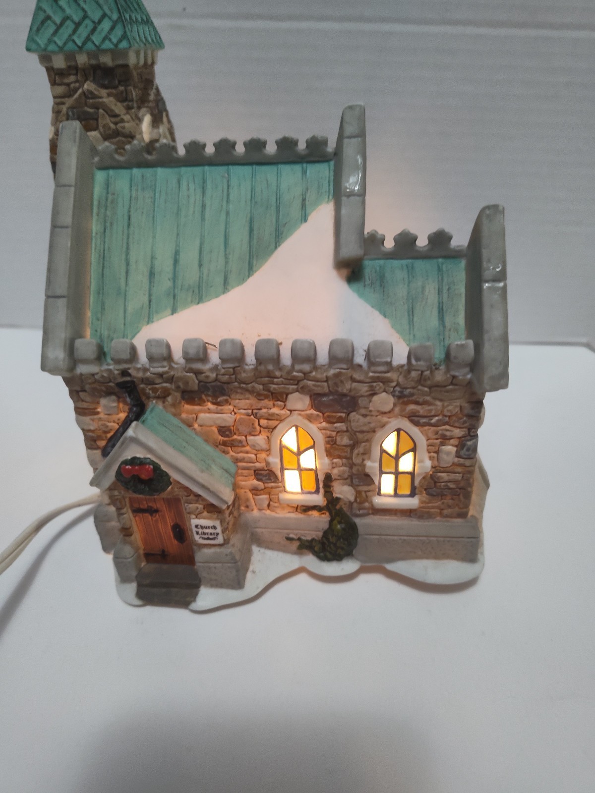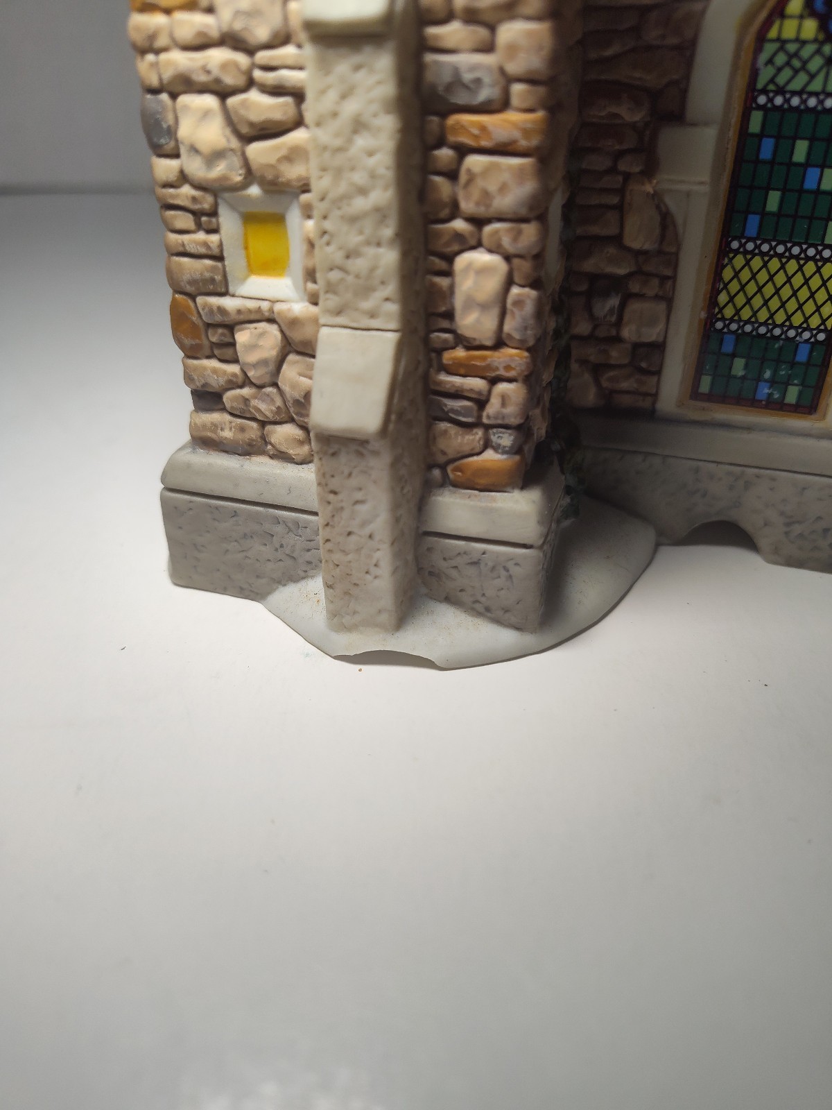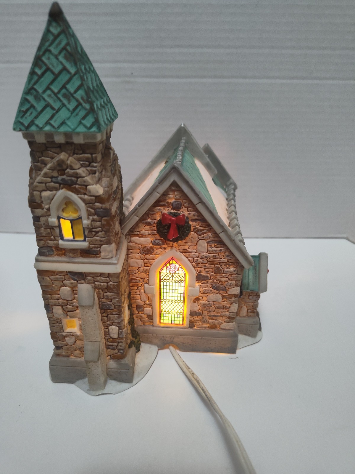 This piece has gorgeous stained-glass window detailing and a classic stone church design. Perfect for Christmas village displays or Dickens Village collections.