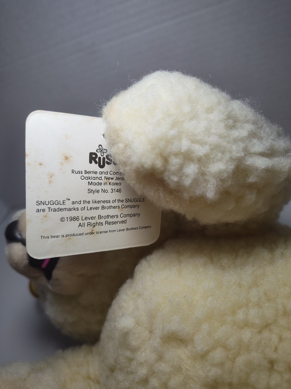 Vintage 1986 RUSS BERRIE Snuggle Fabric Softener Bear Plush Approx 12" with Tags