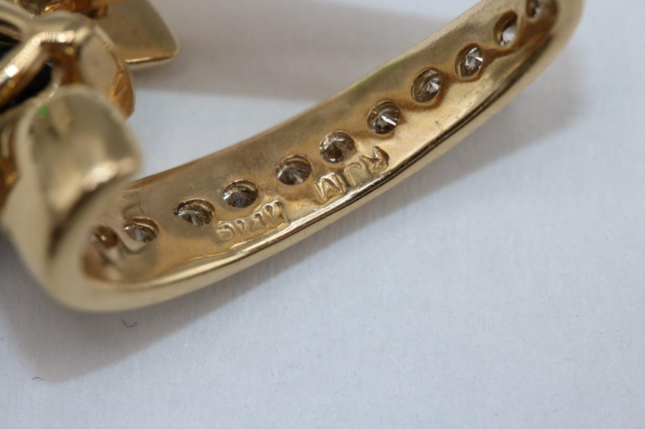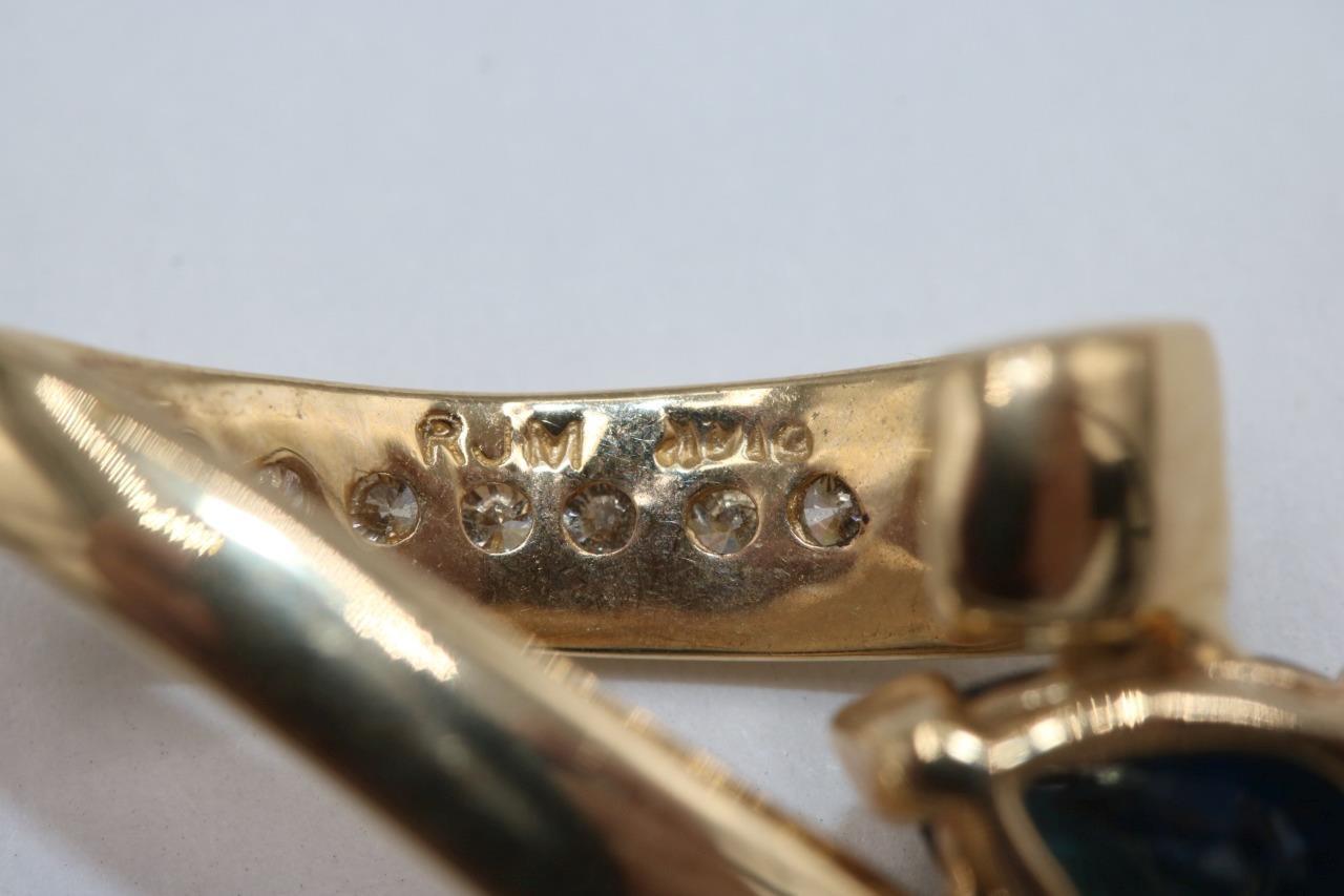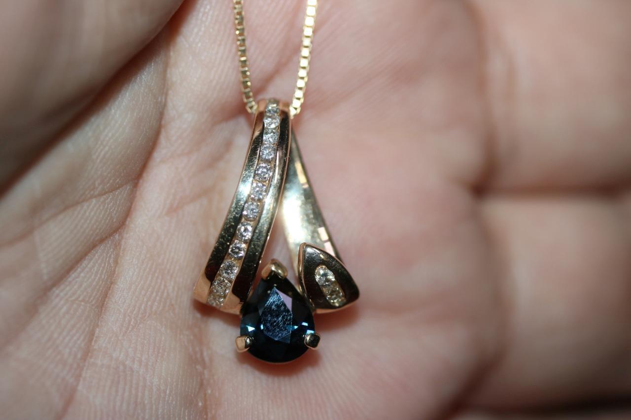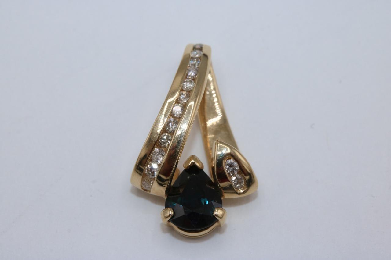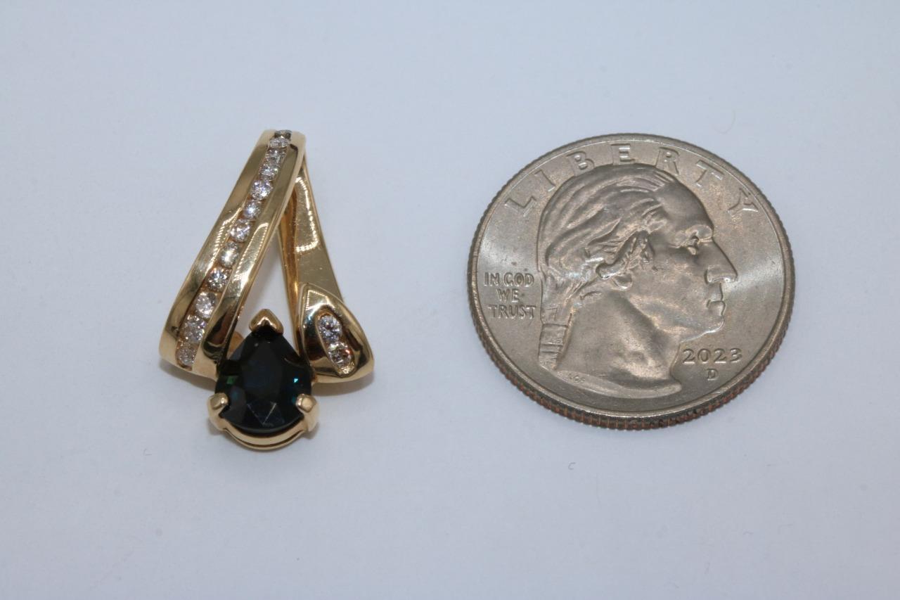 14K Yellow Gold Slider Swirl Ribbon Natural Diamond Pendant w/ Blue Stone 4.2 gr
