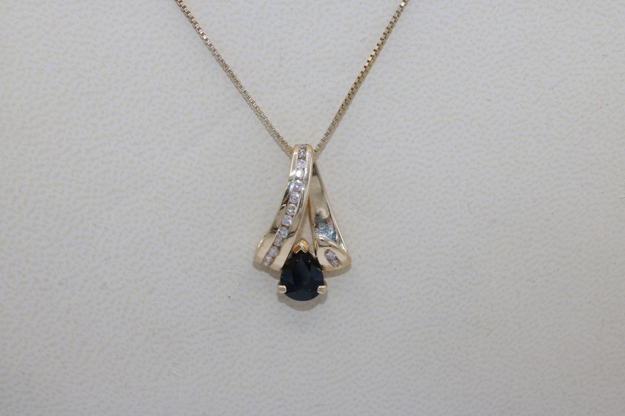 14K Yellow Gold Swirl Ribbon Blue Stone Natural Diamond Pendant Charm