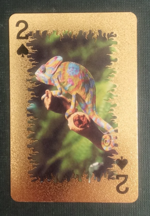 This is for a Animal-Themed Golden Foil PVC Mini Playing Card Chameleon 2 Spades.
