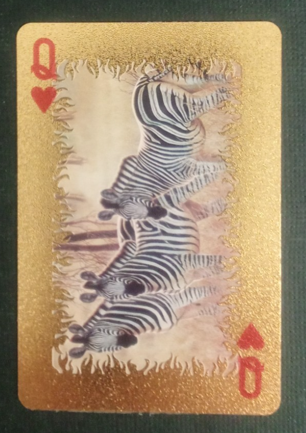 This is for a Animal-Themed Golden Foil PVC Mini Playing Card Zebra Queen Hearts.