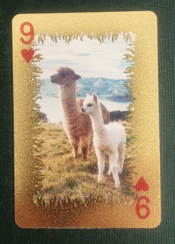 This is for a Animal-Themed Golden Foil PVC Mini Playing Card Llamas 9 Hearts.