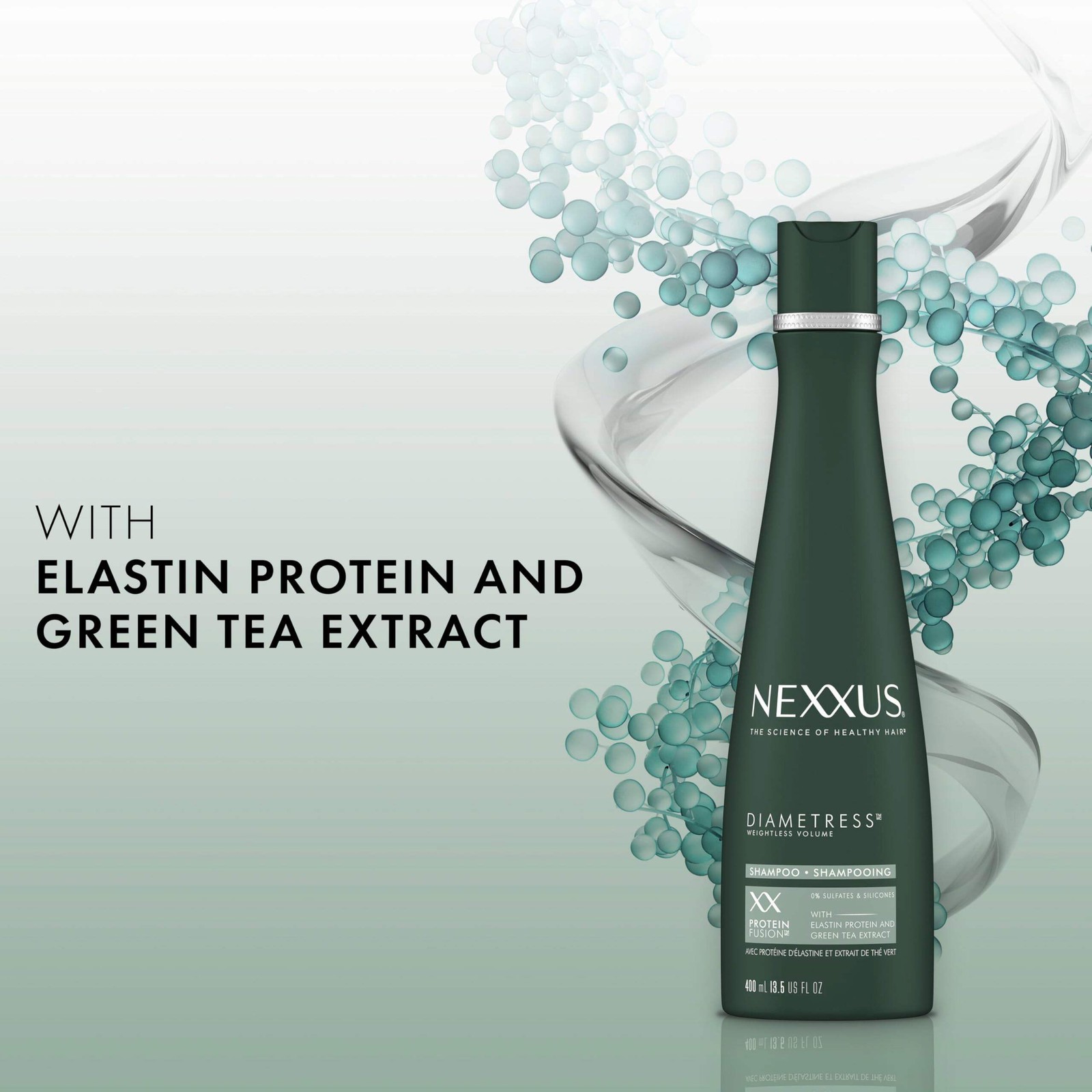 Lot of 3 ? Step 1: Volumizing shampoo (13.5 oz) gently cleanses hair for Luscious Volume ? Enriched with Green Tea Extract and Concentrated Elastin Protein ? Salon-crafted, silicone-free Nexxus shampoo volumizes fine, flat hair ? Increases diameter of each hair strand, releasing beautiful movement and volume ? POWERFUL PROTEIN INFUSION: Visibly heal signs of hair damage. Nexxus H4 Complex restores the four signs of hair health: strength, elasticity, shine and moisture. Bring the salon experience home ? Helps create volume for fine and flat hair