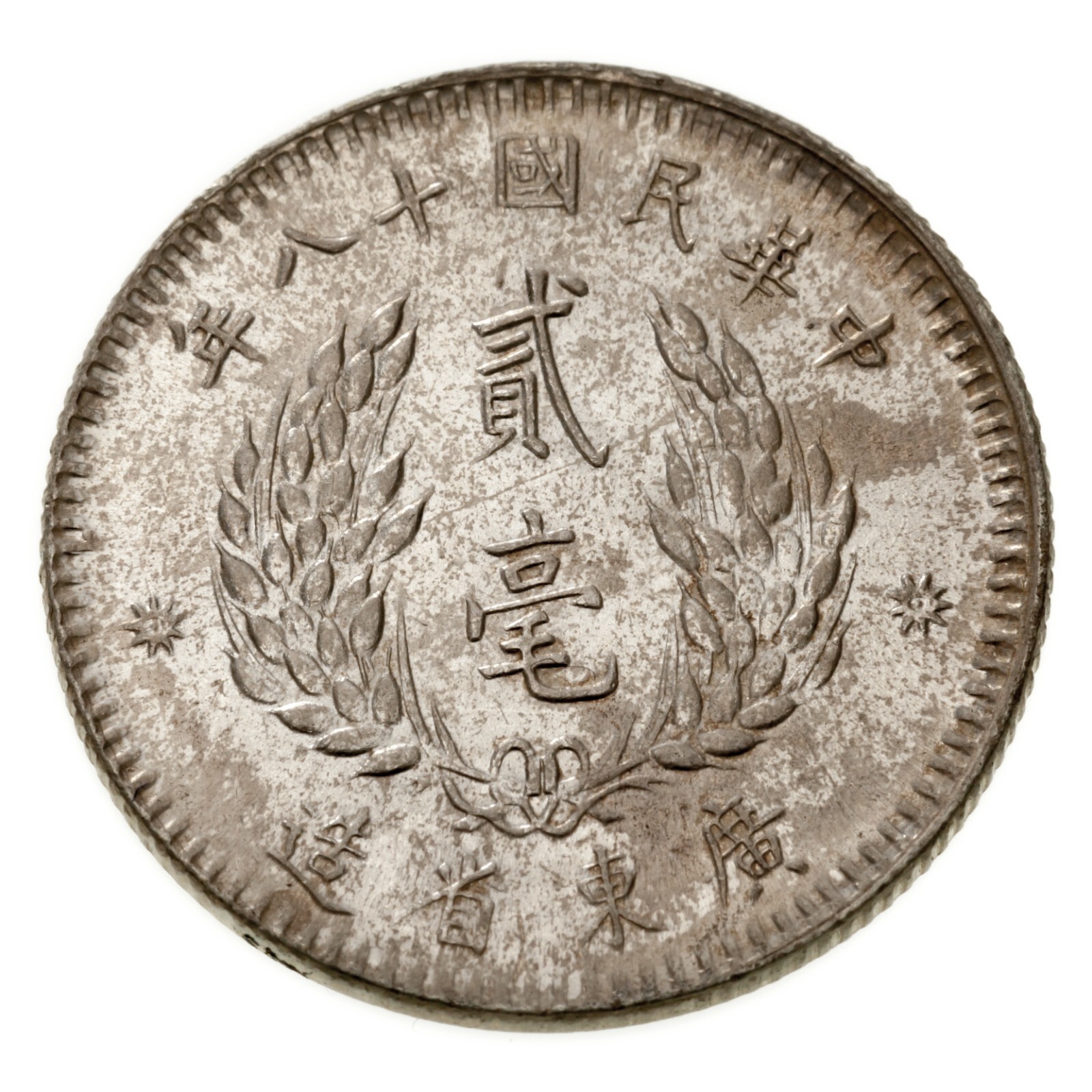 1929 (Yr18) China Kwangtung Provincial 20 Cent Silver Coin, Au. Y#426- show o...