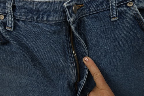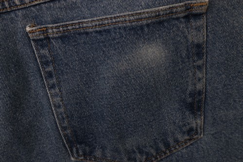 Loose threads waist. Blemish back right pocket. Discoloing throughout. Thread bare/discoloring waist, pockets, cuffs. Distressed and faded. Patch distressed