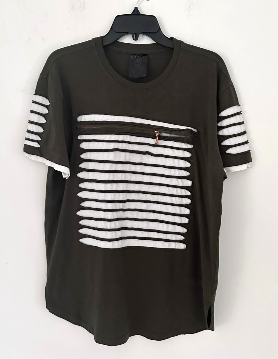 Switch Remarks Men's XL Olive Green Stripe T-Shirt Zipper Pocket Streetwear Tee