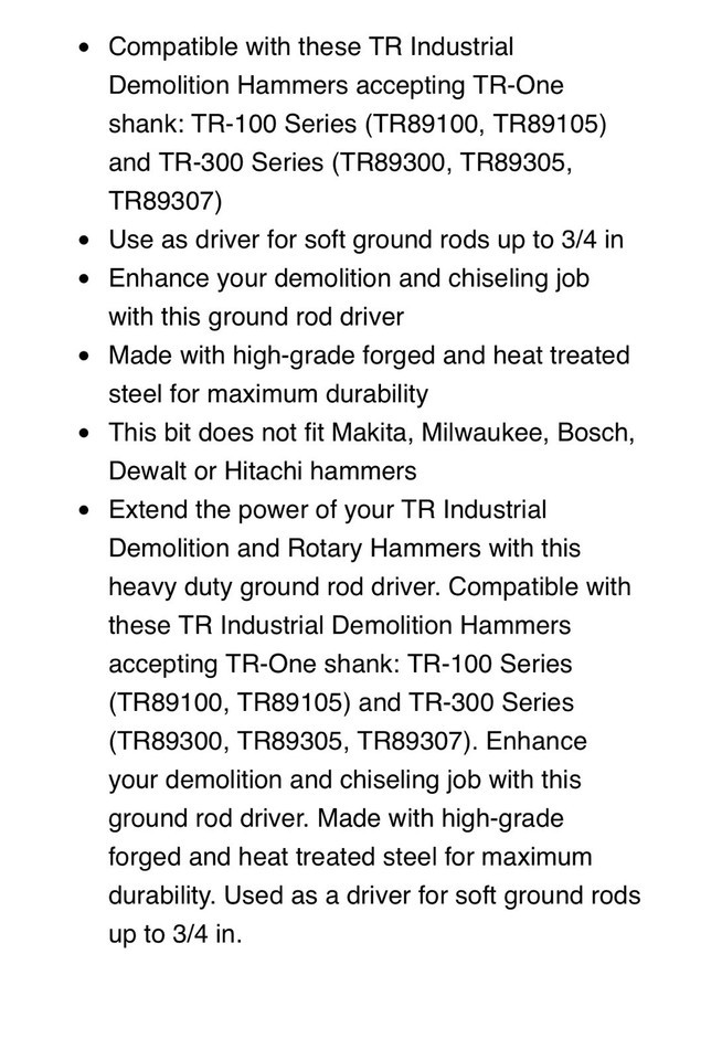 TR-One 1” Shank For TR100 & TR300 Series Hammers 3/4” Ground Rod Driver Bit