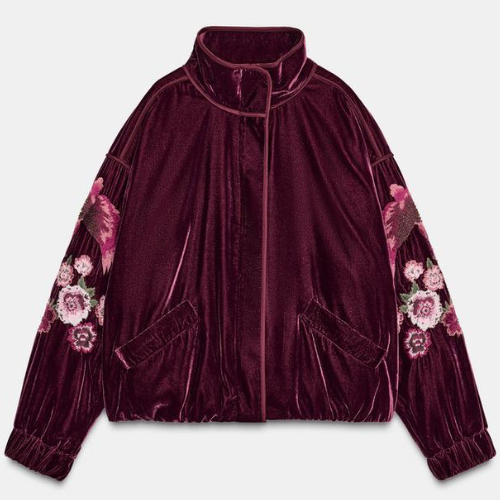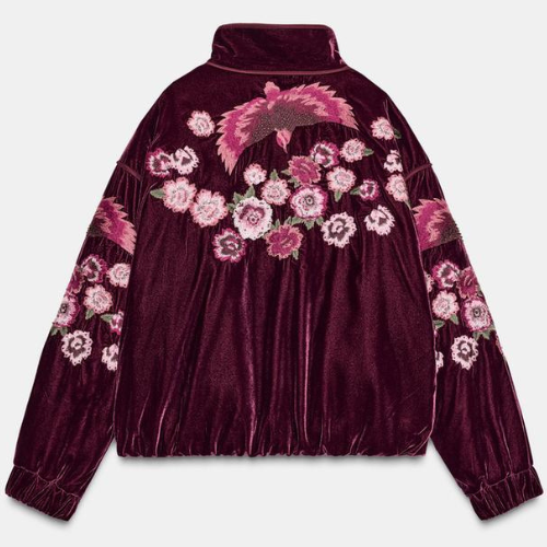 Padded plum jacket made of velvet fabric. High collar and long sleeves. Welt pockets at the sides. Contrasting floral embroidery detail and bead applique. Matching inner lining. Front fastening with concealed zip and button.