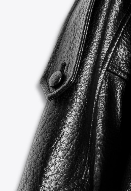 Jacket black with a stand-up collar and long sleeves with tab detail on the shoulders. Side pockets. Contrasting lining. Zip-up fastening with a snap-button placket on the front." Saint Laurent Vibes"