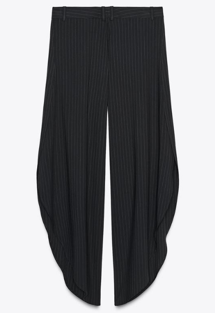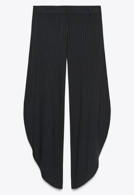 Trousers striped made from a spun viscose blend. Mid-rise and waistband with belt loops. Asymmetric hem with side vents. Front zip, button and metal hook fastening.