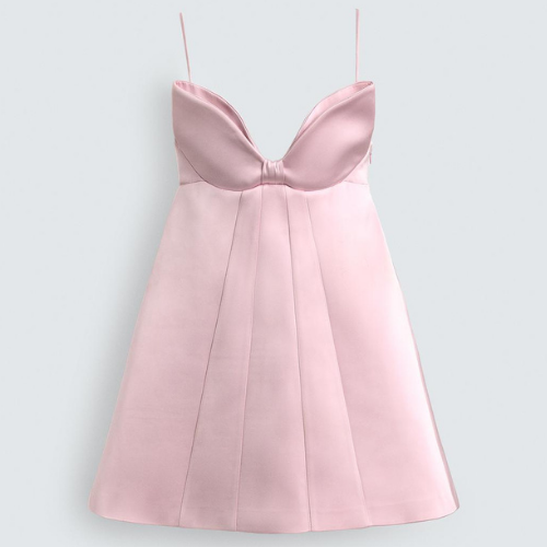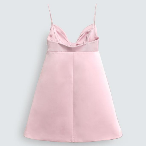 Mini pink mauvedress made in compact satin fabric. A-line. Thin straps and V-neck with overlapping bow effect. Concealed zip fastening in the side seam.