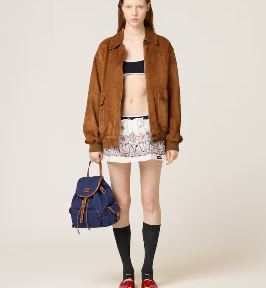 Jacket brown taupe made in 100% suede leather. Long sleeves finished with buckled cuffs on the shoulder. Front pockets and chest flap pockets. Front zip fastening and button-down storm flap. " Miu Miu Vibes"