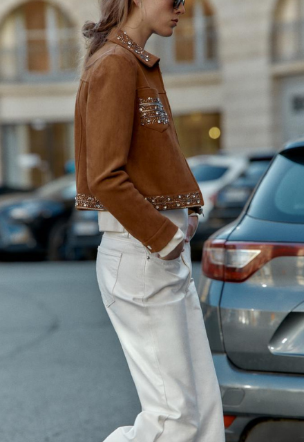 Jacket brown made in faux suede fabric. Lapel collar and long sleeves with cuffs. Front patch pockets. Stud applique detail. Metal zip-up front.