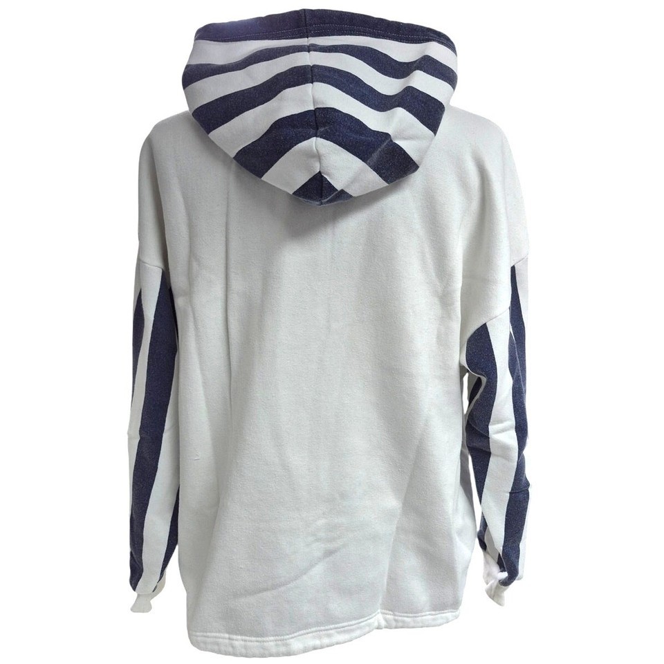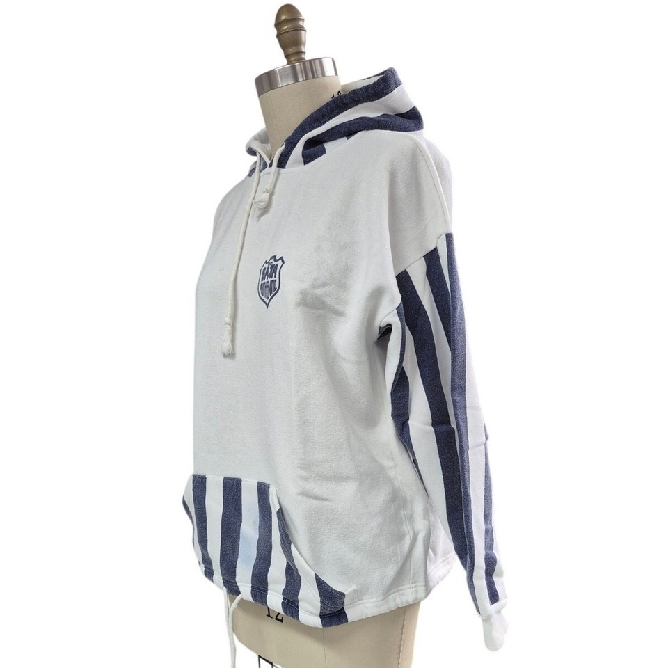 Authentic "Either Or Team Baja" hoodie in white and blue stripes! Features a drawstring waist and a relaxed M/L fit. While the pocket has a fade mark and small stain (shown in photos), the rest is in very good condition. Still a super wearable piece! Dig that Baja style? Grab this comfy hoodie today!