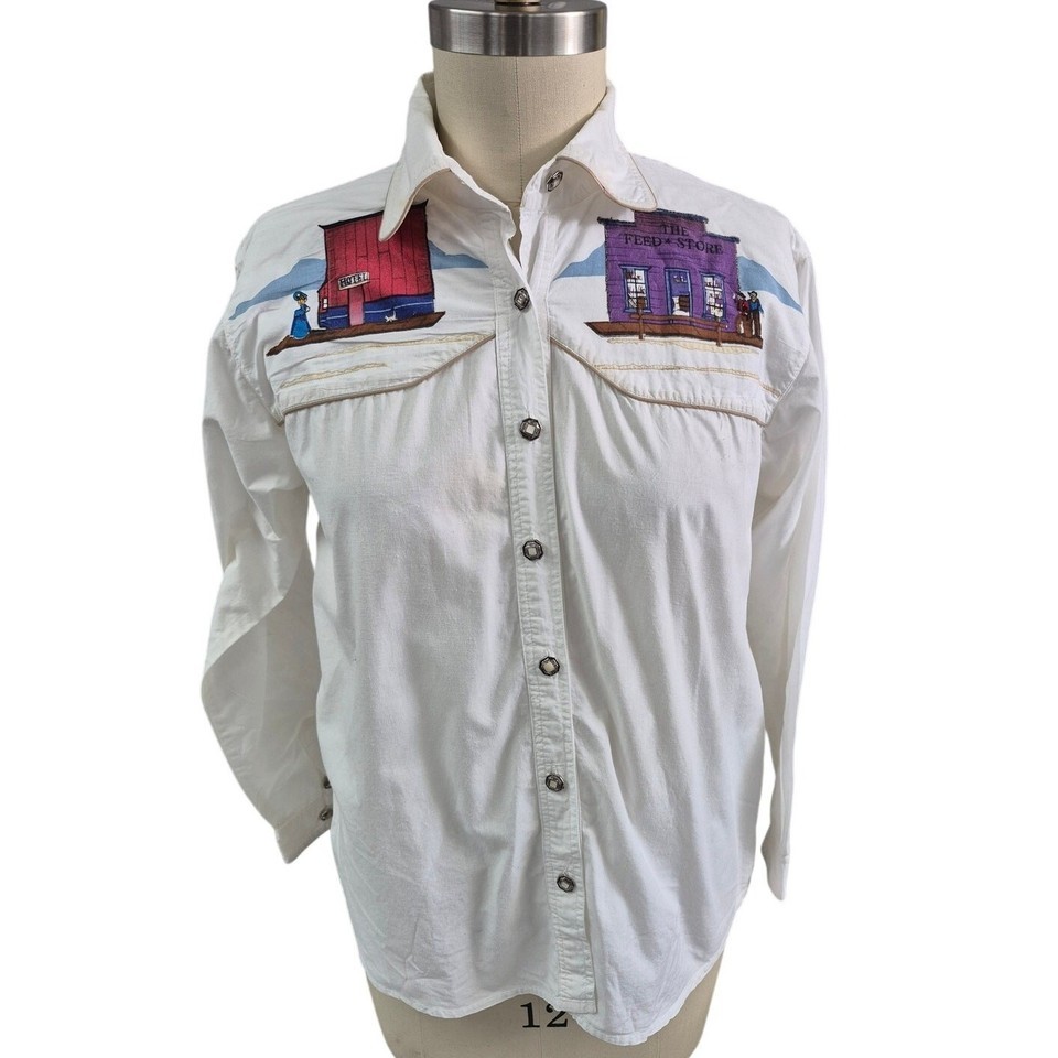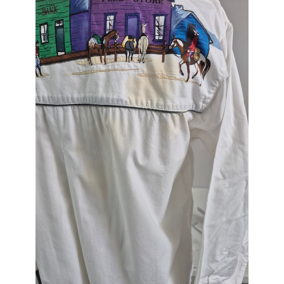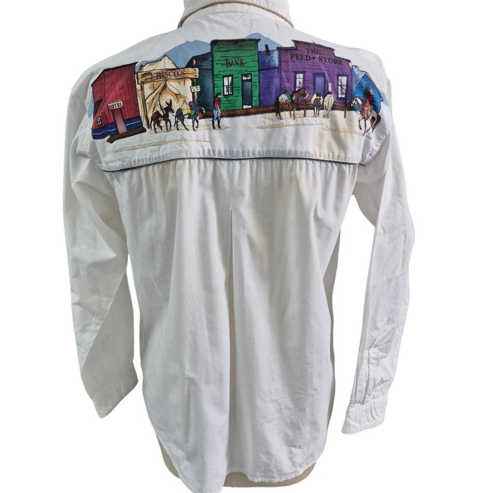 Vintage 80s 90s White Cotton Western Shirt - Cute Town Print - Womens M/L