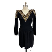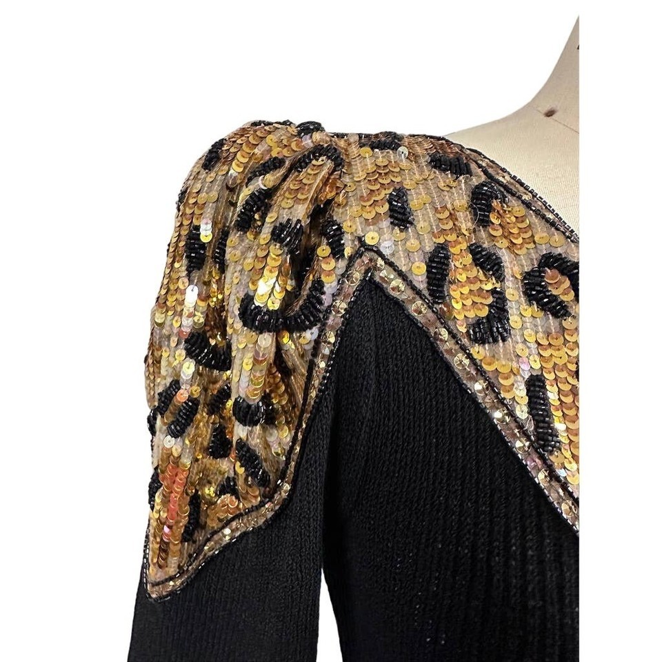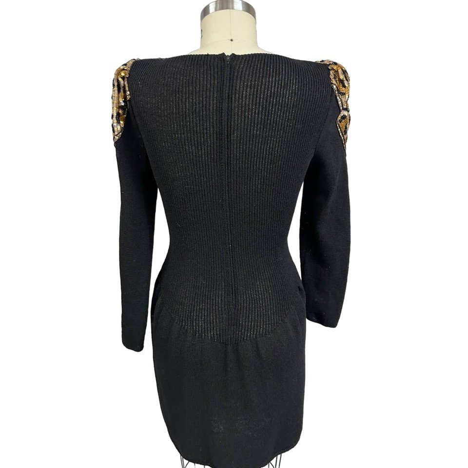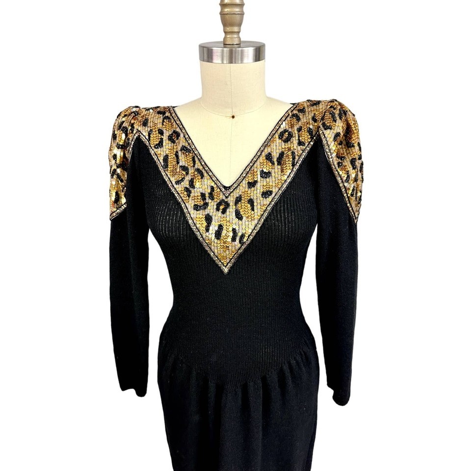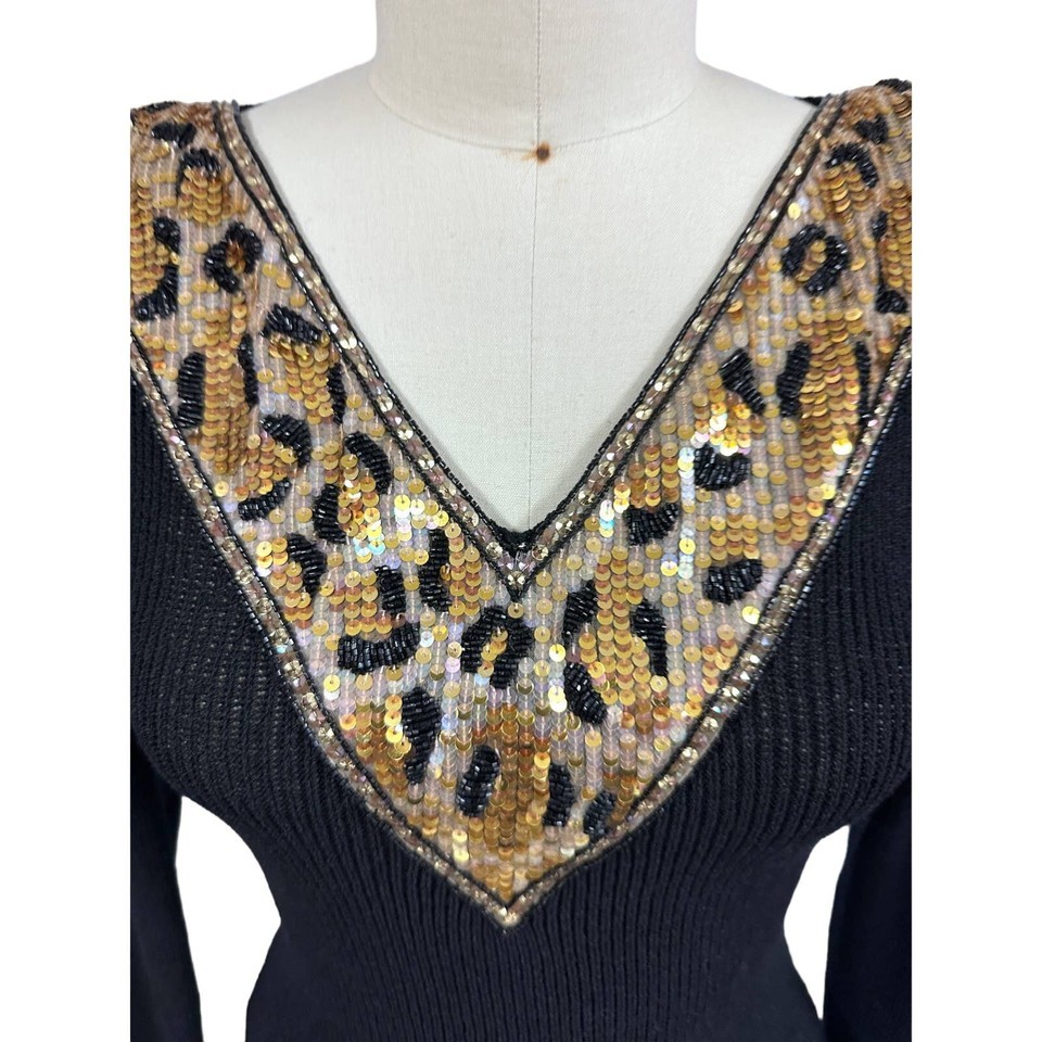 Pat Sandler VTG 80s Black Knit Wiggle Dress Beaded Sequin Leopard Panel Mob Wife