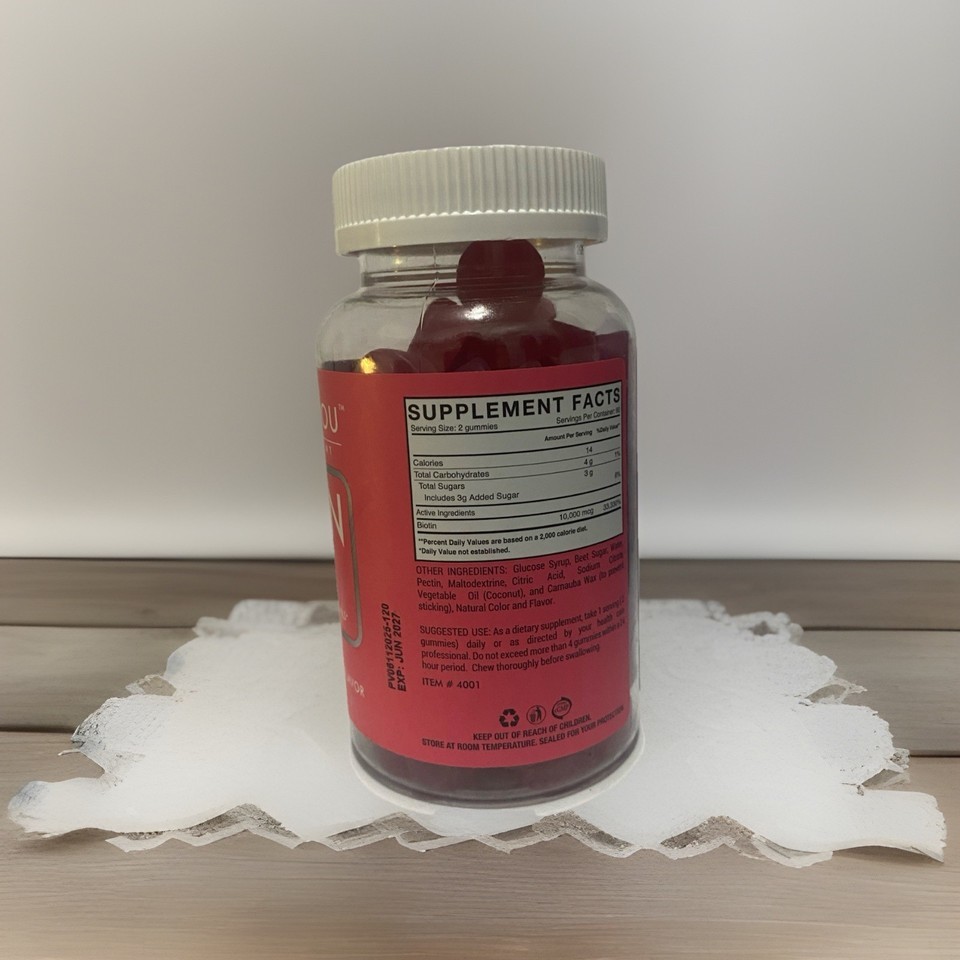 Biotin supplement promotes healthy hair nails High potency 10,000mcg,120 gummies strawberry flavor. Pectin based