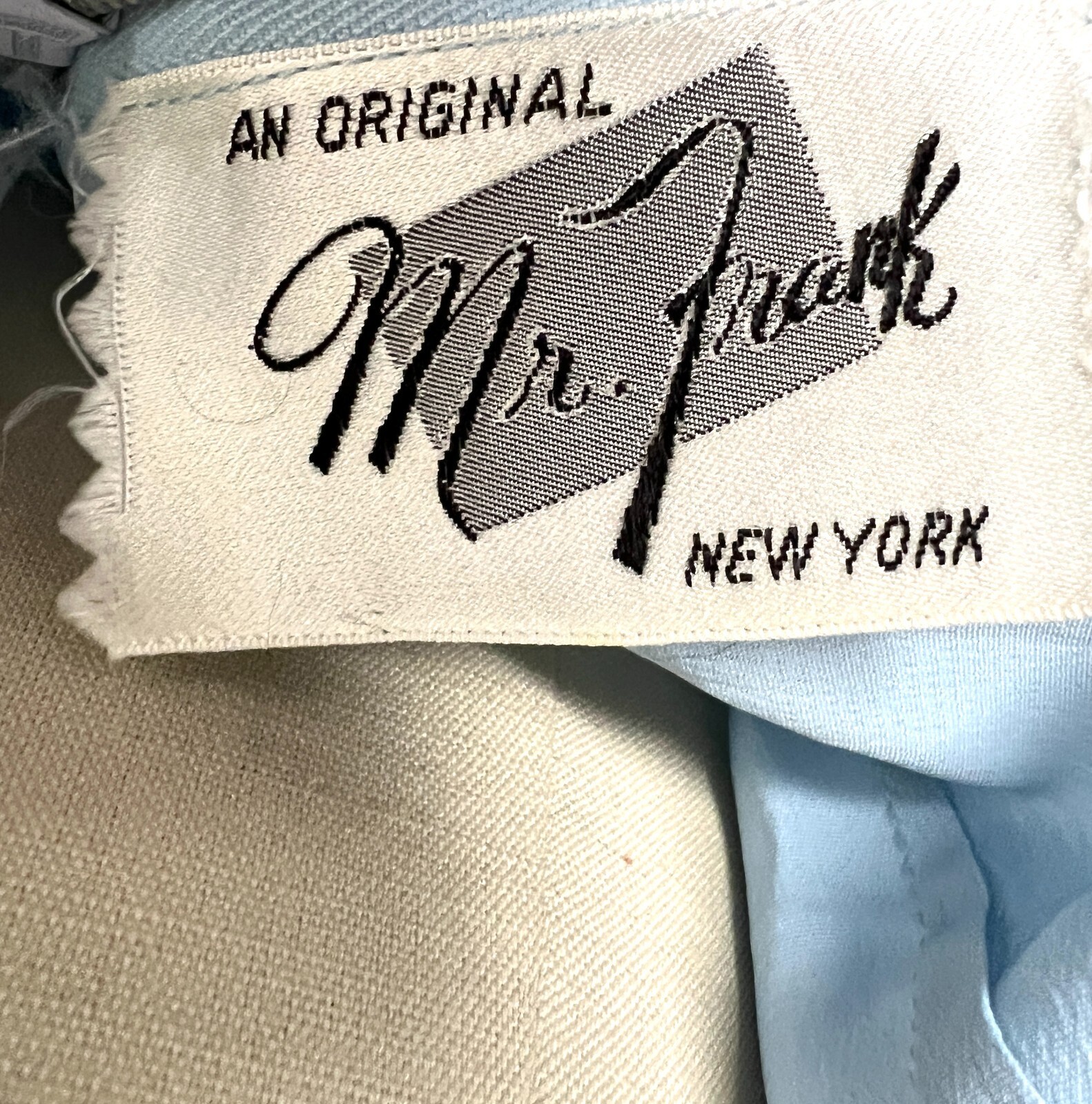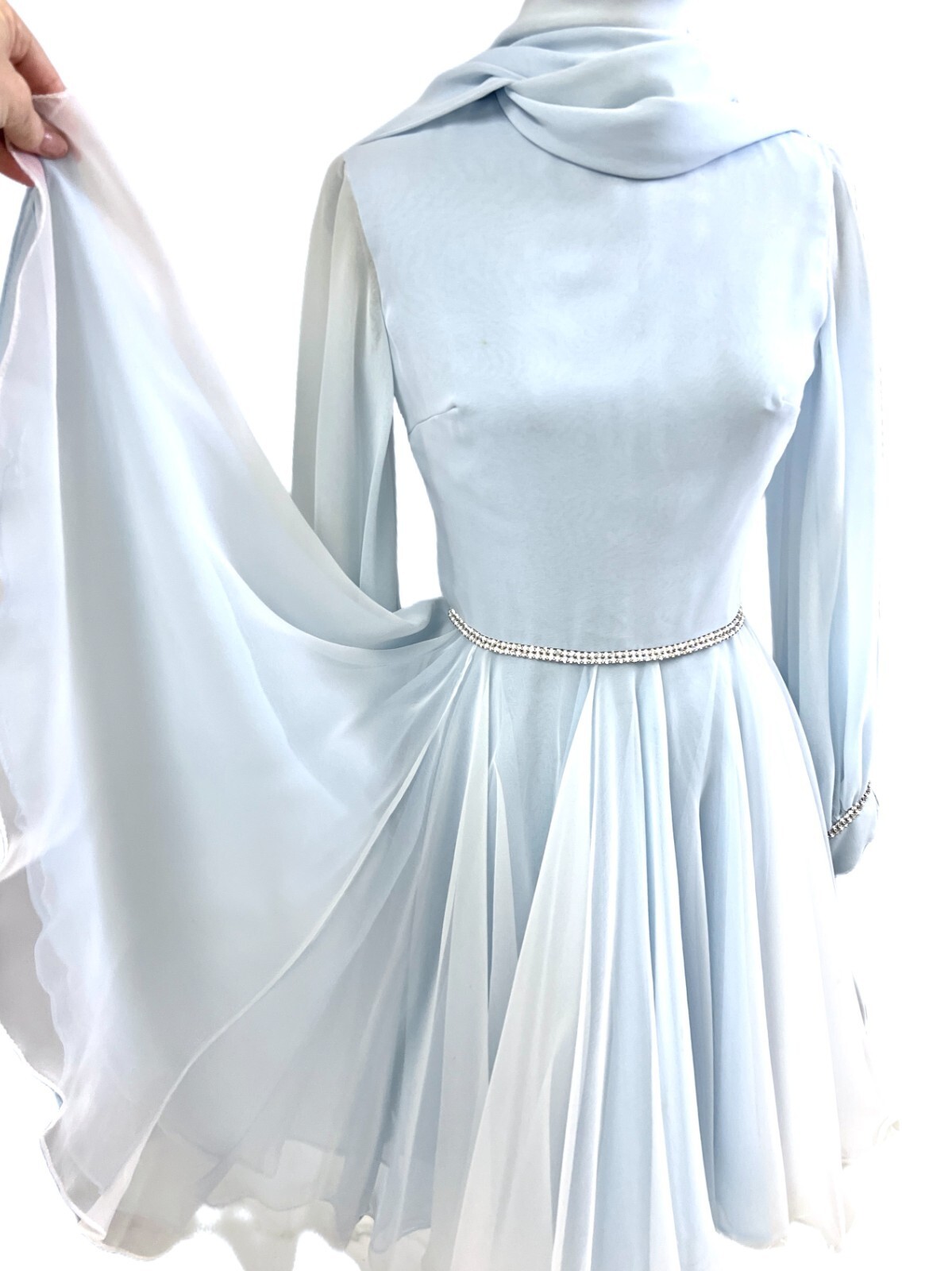 Mr. Frank 1950/60s VTG Pale Blue Layered Chiffon Cocktail Filmy dress Sz 6/S- in excellent condition with one tiny stain on the bust as shown. It is so floaty and swirly, with a blue and a white layer of chiffon over taffeta. It has a pretty trim of white and clear prong set rhinestones on the waist and sleeves. The attached scarf at the neck has a few possibilities for style. Very American TWA stewardess leaning. Super cute, and fun to wear. It fits the modern size 6 mannequin perfectly. Full circle skirts.