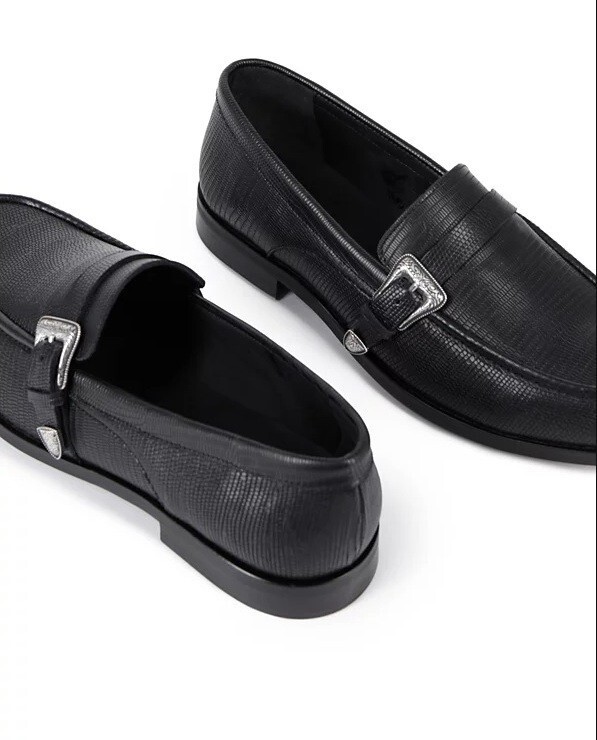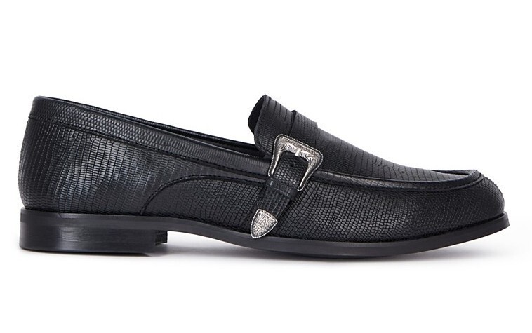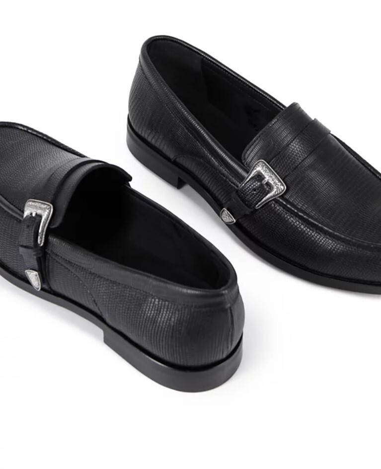 Step up your footwear collection with these high-style loafers from The Kooples. Designed with a sleek silhouette and embossed with a subtle lizard texture, these loafers feature a western-inspired silver-tone buckle that adds just the right amount of edge to their sophisticated look.